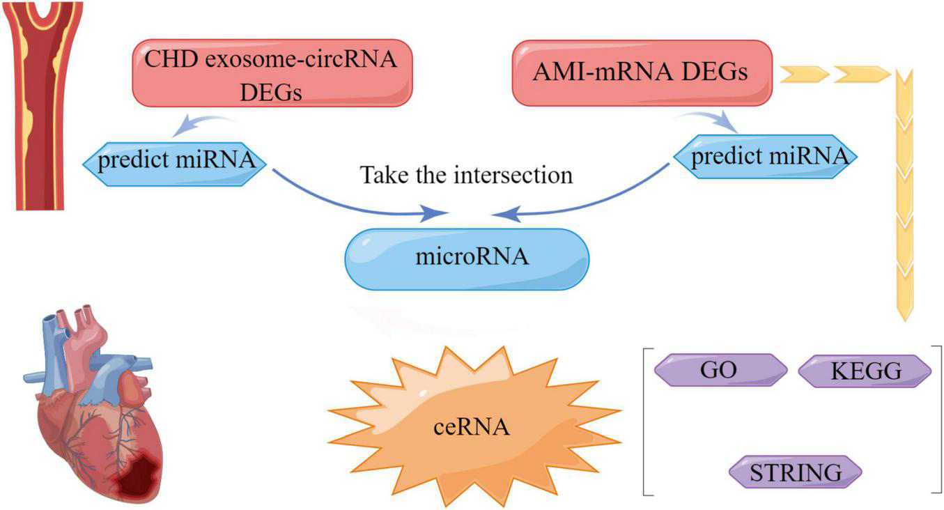 This study was conducted using Target Scan Human 7.22 and miRanda3 to predict the microRNA corresponding to the mRNA. ENCORI4 was used to predict the corresponding microRNAs of the circRNA. Circular RNA interactive identified corresponding circ-microRNA and micro-mRNA targets. Finally, the prediction data of circRNA with differential expression in the exosomes of patients diagnosed with CHD, mRNA derived from the blood of patients with acute myocardial infarction and their corresponding microRNA were obtained to construct a circRNA-microRNA-mRNA-related ceRNA regulatory network.