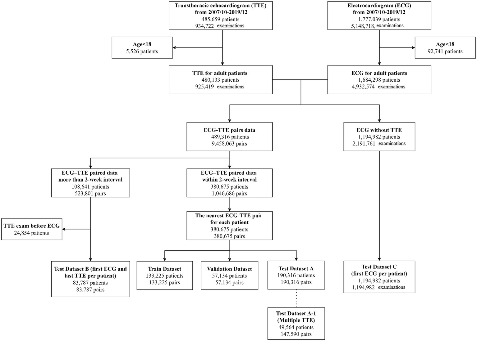 This study was conducted at Chang Gung Memorial Hospital (CGMH), the largest private hospital system in Taiwan. The study population included consecutive adult patients (age ≥ 18) who underwent standard 12-lead ECG at CGMH between October 2007 and December 2019 (1,777,039 individuals, 5,148,718 ECG tracings). ECGs with poor recording quality or unavailable leads were excluded. The ECG data were linked to the Chang Gung Research Database (CGRD), which included the electronic health records of all patients who visited any one of the following seven hospitals: Keelung, Taipei, Linkou (headquarters), Taoyuan, Yunlin, Chiayi, and Kaohsiung.