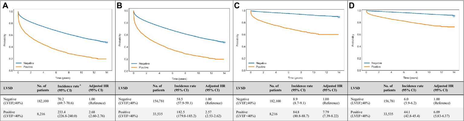 Associations of echocardiogram and DNN-signal predictions with all-cause and cardiovascular mortalities. Age- and sex-weighted Kaplan–Meier curves, death rates, and adjusted HRs (95% CI) stratified by (A) echo-derived LVSD for all-cause mortality (blue line, LVEF≥40%; yellow line, LVEF<40%), (B) DNN signal-predicted LVSD for all-cause mortality (blue line, LVEF≥40%; yellow line, LVEF<40%), (C) echo-derived LVSD for cardiovascular mortality (blue line, LVEF≥40%; yellow line, LVEF<40%), (D) DNN signal-predicted LVSD for cardiovascular mortality (blue line, LVEF≥40%; yellow line, LVEF<40%). a Adjusted K-M curves were adjusted by the inverse probability of treatment weighting, which calculated using sex and age. b The unit of incidence rate was 1,000 person-years. CI, confidence interval; DNN, deep neural network; LVEF, left ventricular ejection fraction.