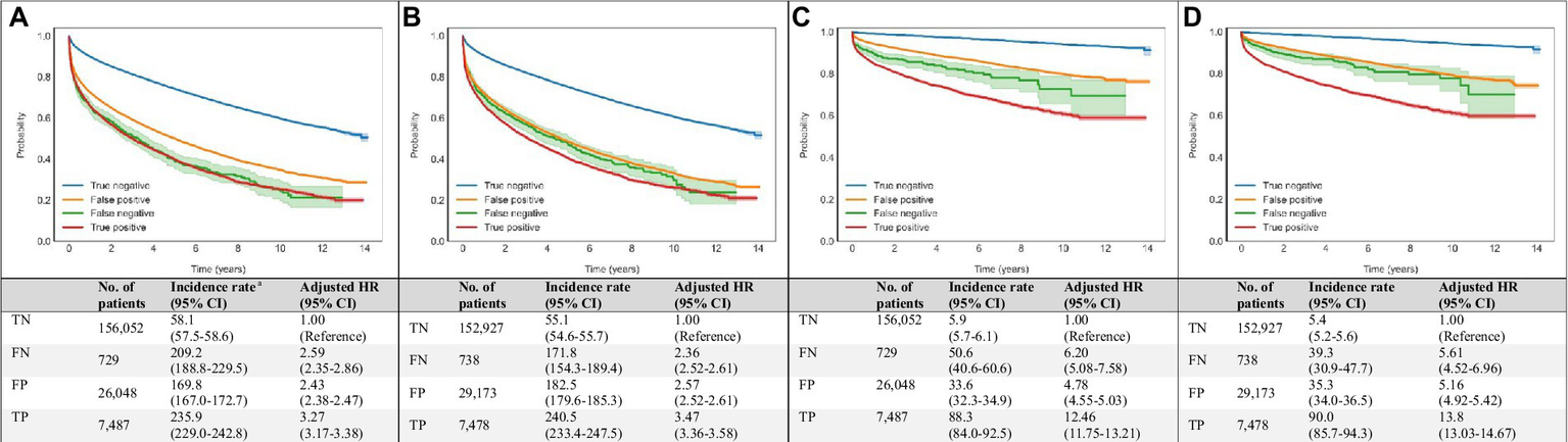 Associations of DNN-signal and DNN-image predictions with all-cause and cardiovascular mortalities. Age- and sex-weighted Kaplan–Meier curves, death rates, and adjusted HRs (95% CI) stratified by both echocardiography and DNN (true negative: blue line, both echo-measured and DNN-predicted LVEF ≥40%; false negative: green line, echo-measured LVEF <40% and DNN-predicted LVEF ≥40%; true positive: red line, both echo-measured and DNN-predicted LVEF <40%; and false positive: yellow line, echo-measured LVEF ≥40% and DNN-predicted LVEF <40%) for all-cause and cardiovascular mortality (A) DNN-signal predictions and all-cause mortality, (B) DNN-image predictions and all-cause mortality, (C) DNN-signal predictions and cardiovascular mortality, and (D) DNN-image predictions and cardiovascular mortality. a Adjusted K-M curves were adjusted by the inverse probability of treatment weighting, which calculated using sex and age. b The unit of incidence rate was 1,000 person-years. CI, confidence interval; DNN, deep neural network; EF, ejection fraction; FN, false negative; FP, false positive; HR, hazard ratio; K-M, Kaplan–Meier; LVSD, left ventricular systolic dysfunction; No., number; TN, true negative; TP, true positive.