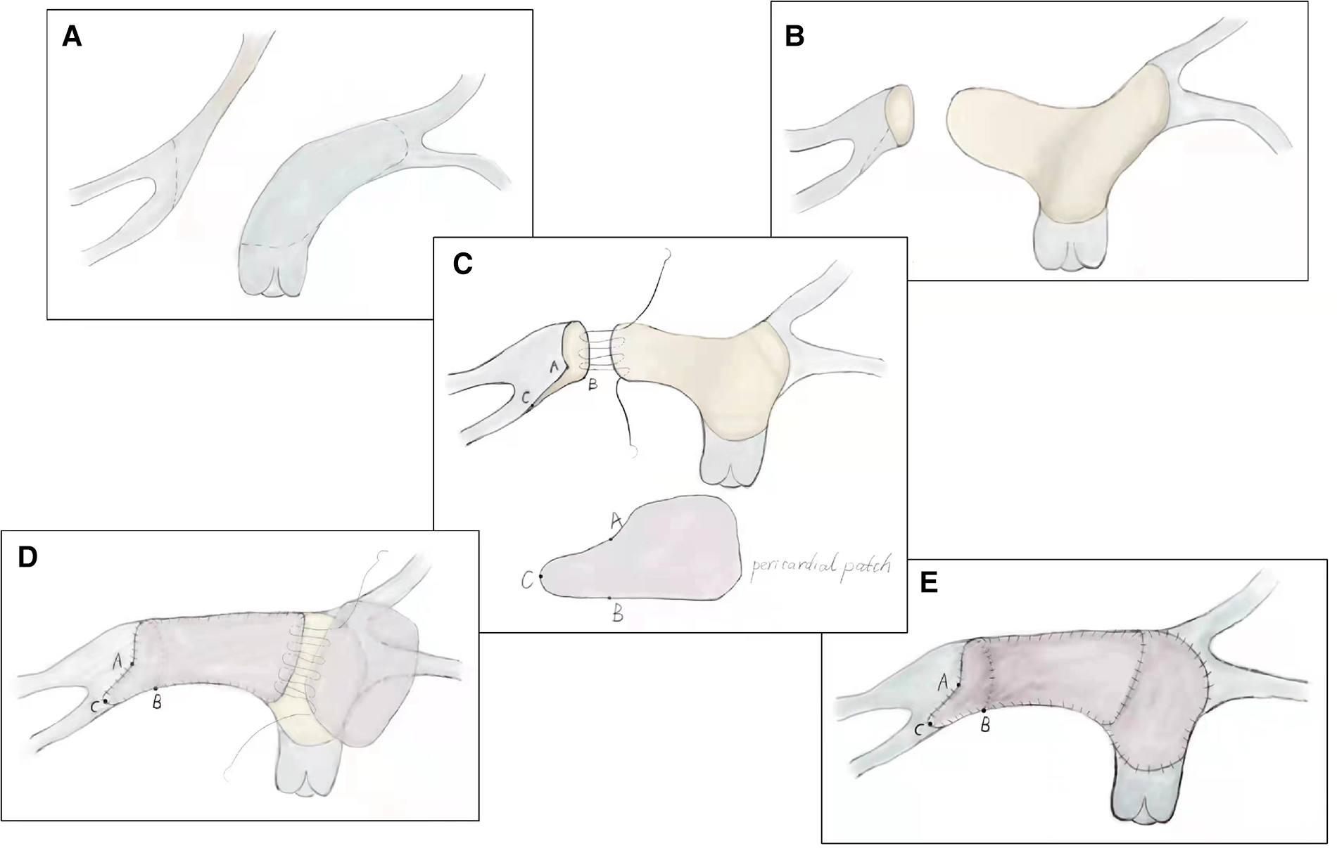 Technique of modified pulmonary artery flap angioplasty. (A) Extension flap was created using the anterior wall of main pulmonary artery and left pulmonary artery. (B) Distal incision for the extension flap terminated proximal to the left pulmonary artery hilum. (C) Incision was made along the inferior aspect of the right lower lobar branch to enlarge the right pulmonary artery hilum. (D) Inferior, anterior, and superior aspects of the neo-right pulmonary artery were reconstructed using a glutaraldehyde-treated autologous pericardial patch. (E) Anterior wall of main pulmonary artery and left pulmonary artery was reconstructed with a second treated autologous pericardial patch.