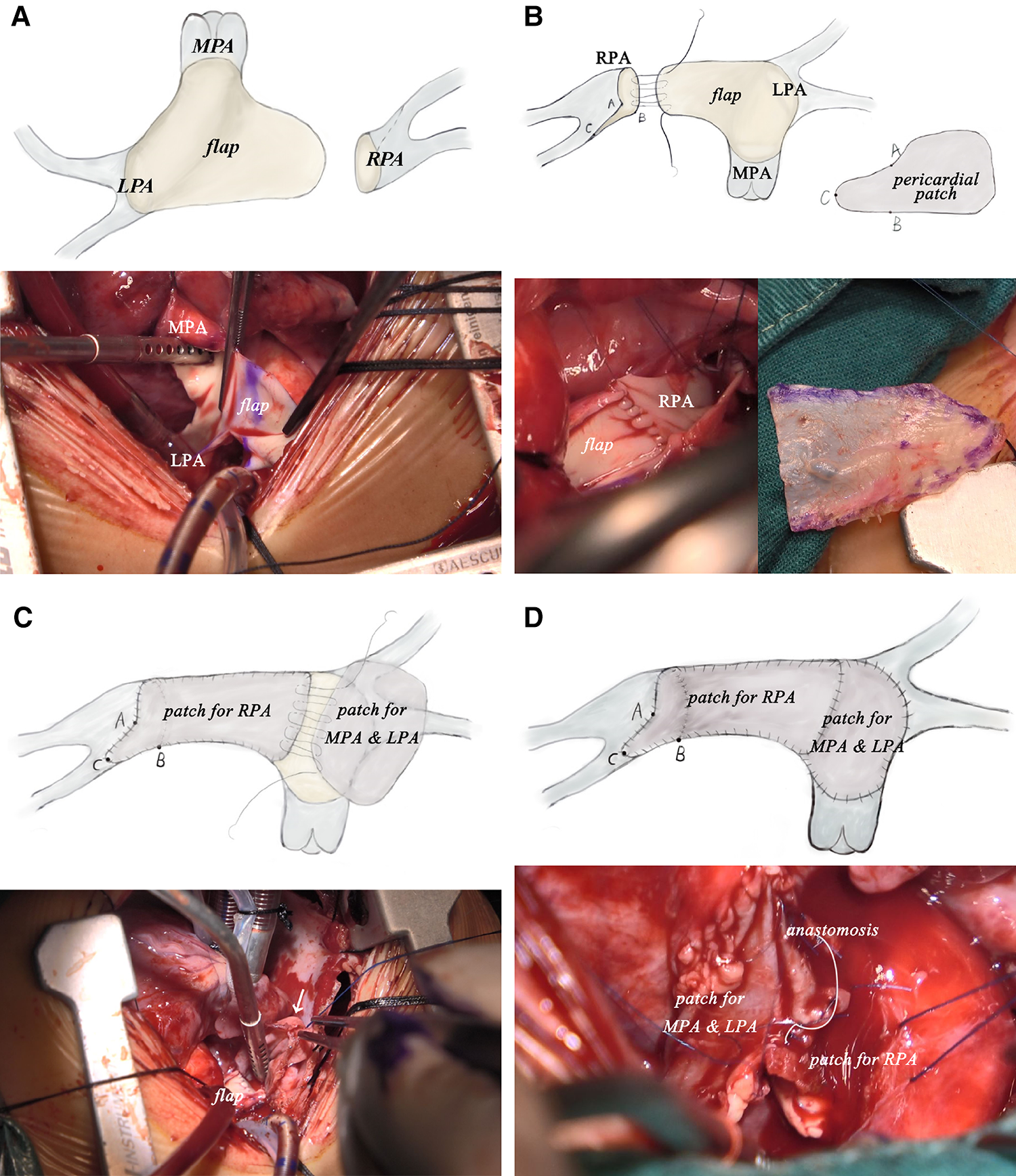 Intraoperative pictures of modified pulmonary artery flap angioplasty corresponding to procedure diagram. (LPA, left pulmonary artery; MPA, main pulmonary artery; RPA, right pulmonary artery.