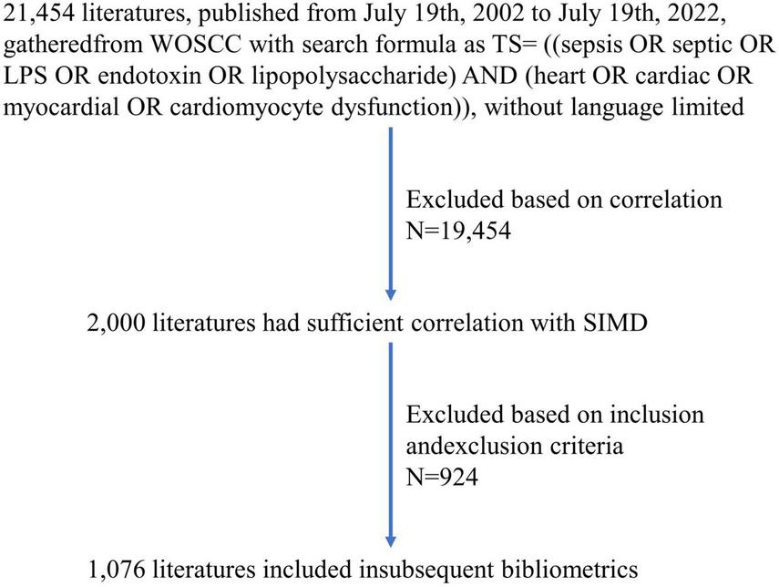 Data was retrieved and extracted from the Web of Science Core Collection (WOSCC) on July 19th, 2022. TS = [(sepsis OR septic OR LPS OR endotoxin OR lipopolysaccharide) AND (heart OR cardiac OR myocardial OR cardiomyocyte dysfunction)] was entered into the search formula. The retrieval time range was from July 19th, 2002 to July 19th, 2022, and language was not limited. A total of 21,454 papers (no duplicates) were gathered, including 19.055 articles and 2,399 reviews. In order to ensure sufficient correlation between literature content and SIMD and reduce the number of literatures to be screened, we used correlation ranking in WOSCC and selected the top 2,000 literatures for detailed screening. These papers were screened according to the following criteria by two independent researchers. Inclusion criteria: (1) the title of the literature deals with SIMD or its synonyms; (2) the background of the literature is related to SIMD; (3) the subjects were patients with SIMD, or the materials were animal or cell models of SIMD; (4) the purpose and conclusion of the literature are related to the mechanism, etiology, diagnosis, treatment or prognosis of SIMD. Exclusion criteria: (1) the main content and central idea of the literature have little association with SIMD; (2) the type of the literature is review, case report or meta-analysis; (3) the content of the literature is clinical treatment guidelines or consensus; (4) WOSCC could not provide complete information about the literature, including title, abstract, keywords, authors and institutions. Articles only need to meet one of these requirements to be included or excluded. Finally, after checking, a total of 1,076 eligible articles were decided for subsequent analysis and were exported in the form of “Full Record and References” and saved as a plain text file named download_txt (Figure 1).