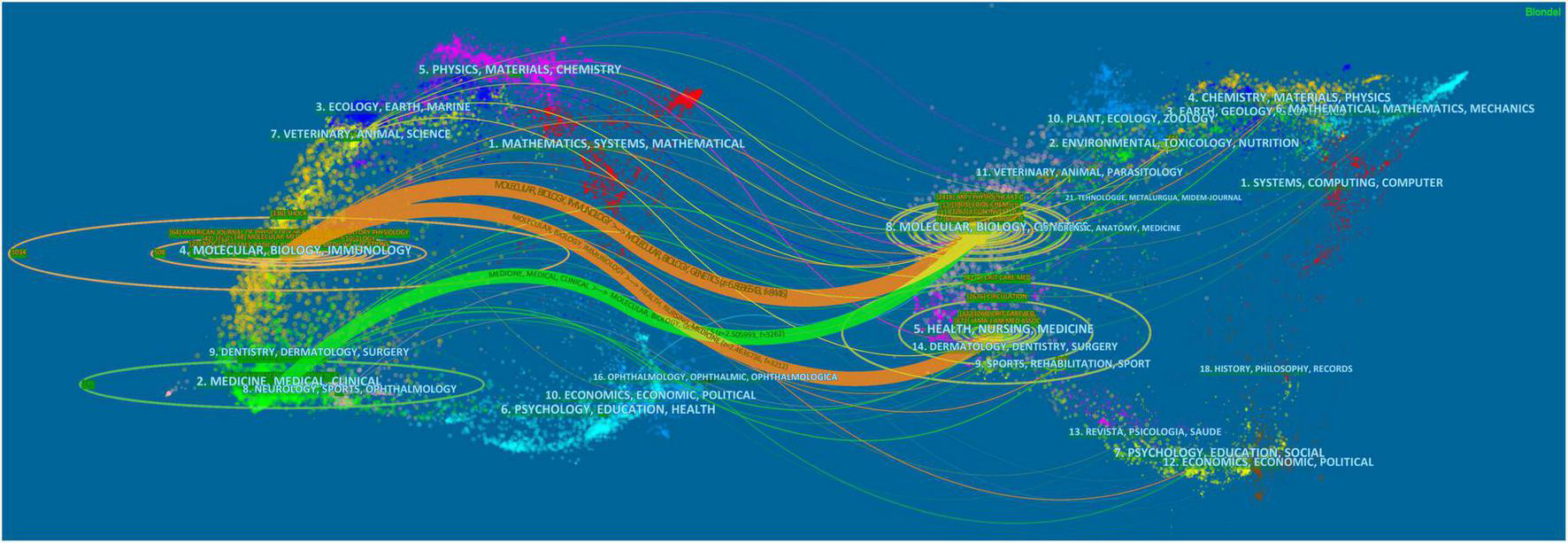 The dual-map overlay of journals can clearly show the distribution of journals and the citation relationship between journals on the left and corresponding co-cited journals on the right (Figure 6). In this way, three main reference paths were identified. It indicated that papers published in Molecular/Biology/Genetics journals were often cited by Molecular/Biology/Immunology and Medicine/Medical/Clinical journals, and that papers published in Health/Nursing/Medicine were also often cited by Molecular/Biology/Immunology.