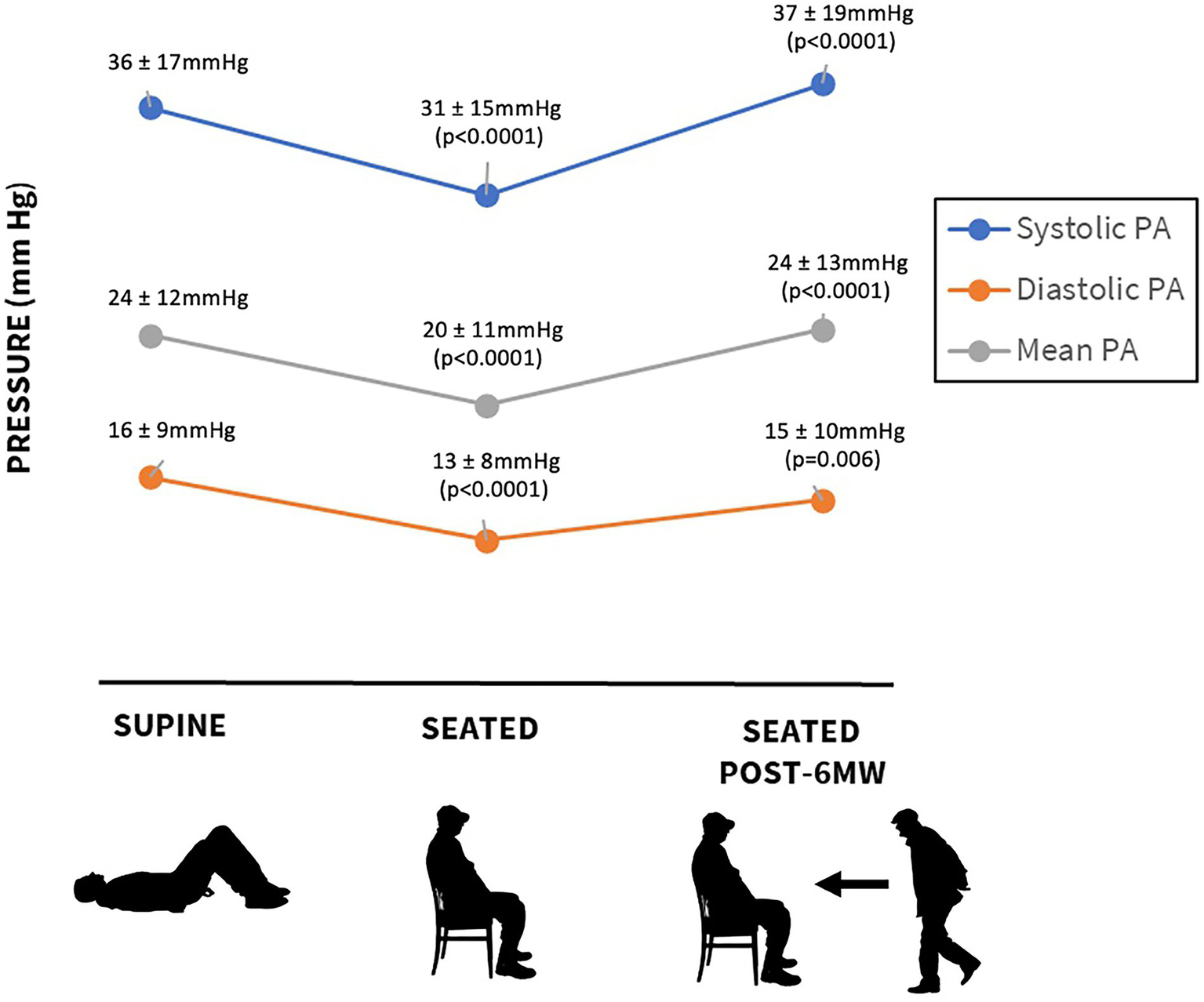 Changes in pulmonary pressures based on position and post 6-min walk (6MW).