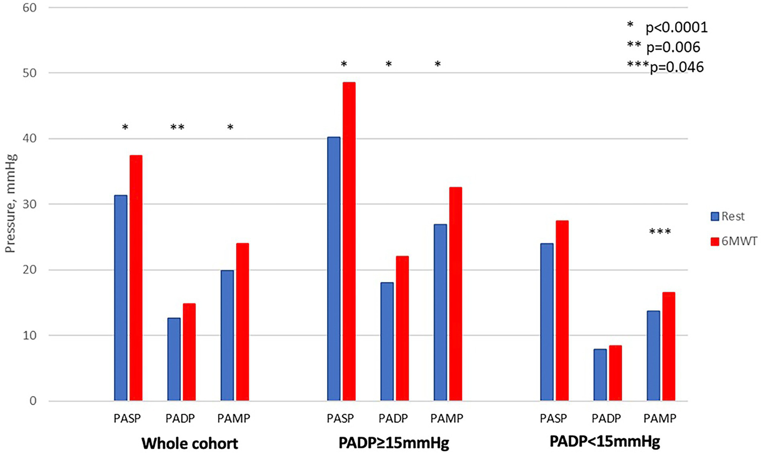 As resting PADP is a therapeutic target in hemodynamic management with CM, we further stratified the cohort according to resting pressures. Because PADP is usually measured in a supine position in clinical practice, we used supine resting PADP to define cohorts with PADP≥15 mmHg and <15 mmHg. After 6MWT, there was a significant increase in all pulmonary pressures in patients with PADP ≥15 mm Hg (p < 0.001) but not in individuals with PADP <15 mm Hg (Table 2 and Figure 2). Heart rate increased significantly in both groups: from 78 ± 12 to 86 ± 14 beats per minute (p = 0.004) and from 74 ± 13 to 86 ± 16 beats per minute (p < 0.001), respectively. There was no correlation between PADP and 6MWT distance.