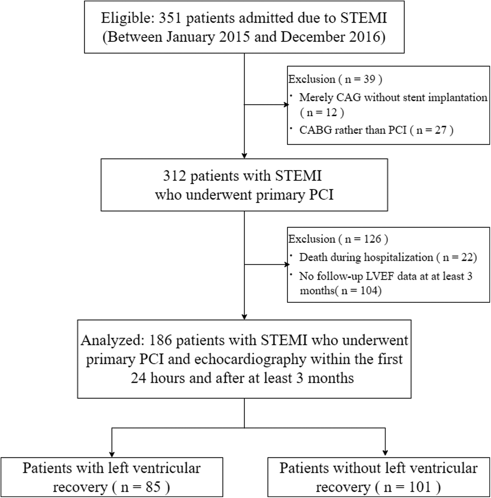 Study flowchart. STEMI, ST-segment elevation myocardial infarction; CAG, coronary angiography; CABG, coronary artery bypass grafting; PCI, percutaneous coronary intervention; LVEF, left ventricular ejection fraction.