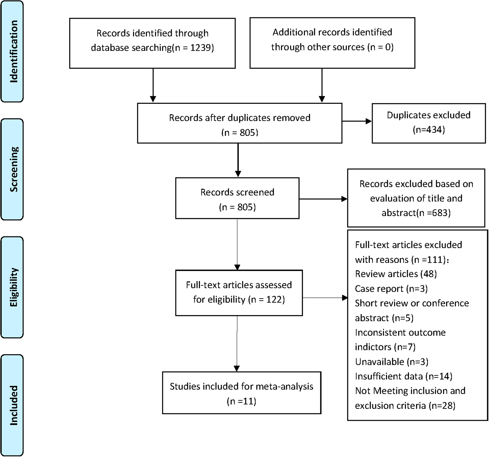 Two individual researchers retrieved for a total of 1,239 studies from Embase, Cochrane library, PubMed and Web of Science through the search strategy. There were 805 studies left after removing duplicate literature and 122 studies left after reading abstract and title. According to inclusion and exclusion criteria, 11 studies were finally included for meta-analysis. The NOS score of the included studies is 5–8, and there are 8 high-quality studies. Figure 1 shows the flow chart of screening.