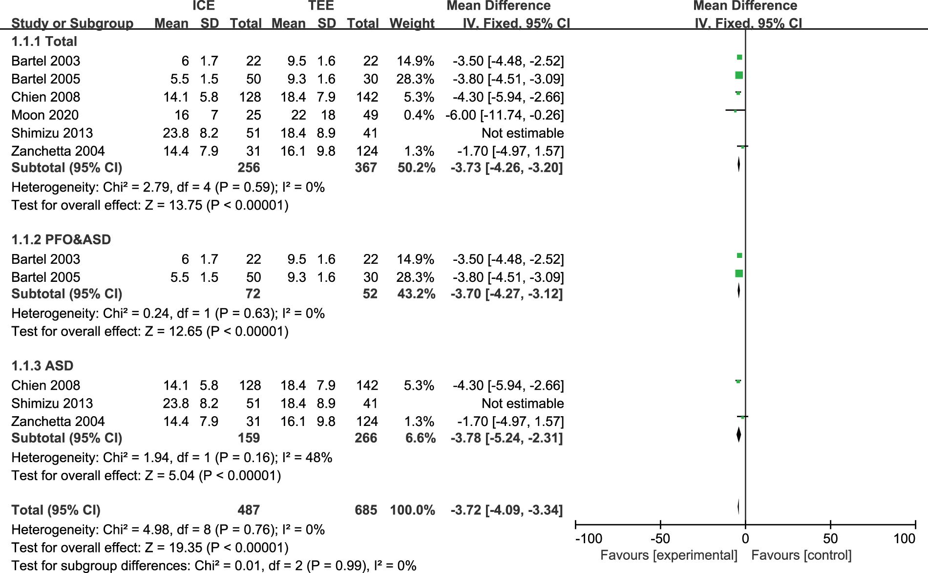 Six studies (23, 25–27, 29, 33) reported fluoroscopy time (FT) with a total of 623 patients and four studies (23, 25–27) reported procedure time (PT) with a total of 598 patients. Due to the high heterogeneity (FT: I2 = 70%, P = 0.0004), we conducted sensitivity analysis in order to explore the sources of heterogeneity. After we removed the Schimizu 2013 (29) study, heterogeneity across the studies was relatively low (FT: I2 = 0%, P = 0.76, PT: I2 = 37%, P = 0.14). Results indicated that times for both fluoroscopy [MD: −3.72 (95%CI: −4.09 to −3.34) minutes, P < 0.00001, Figure 2] and the procedure [MD: −6.43 (95%CI: −7.65 to −5.21) minutes, P < 0.00001, Figure 3] were shorter in ICE group than in TEE group. The subgroup analysis results of ASD patients were consistent with the overall results (FT (total): MD: −3.73 [95%CI: −4.26 to −3.20] minutes, P < 0.00001, FT(PFO&ASD): MD: −3.70 [95%CI: −4.27 to −3.12] minutes, P < 0.00001, FT(ASD): MD: −3.78 [95%CI: −5.24 to −2.31] minutes, P < 0.00001, Figure 2; PT (total): MD: −6.43 [95%CI: −8.16 to −4.71] minutes, P < 0.00001, PT(PFO&ASD): MD: −5.93 [95%CI: −7.83 to −4.02] minutes, P < 0.00001, PT(ASD): MD: −8.74 [95%CI: −12.81 to −4.67] minutes, P < 0.00001, Figure 3). In addition, we would like to conduct further subgroup analysis on patients with PFO, but the data were limited for subgroup analysis.