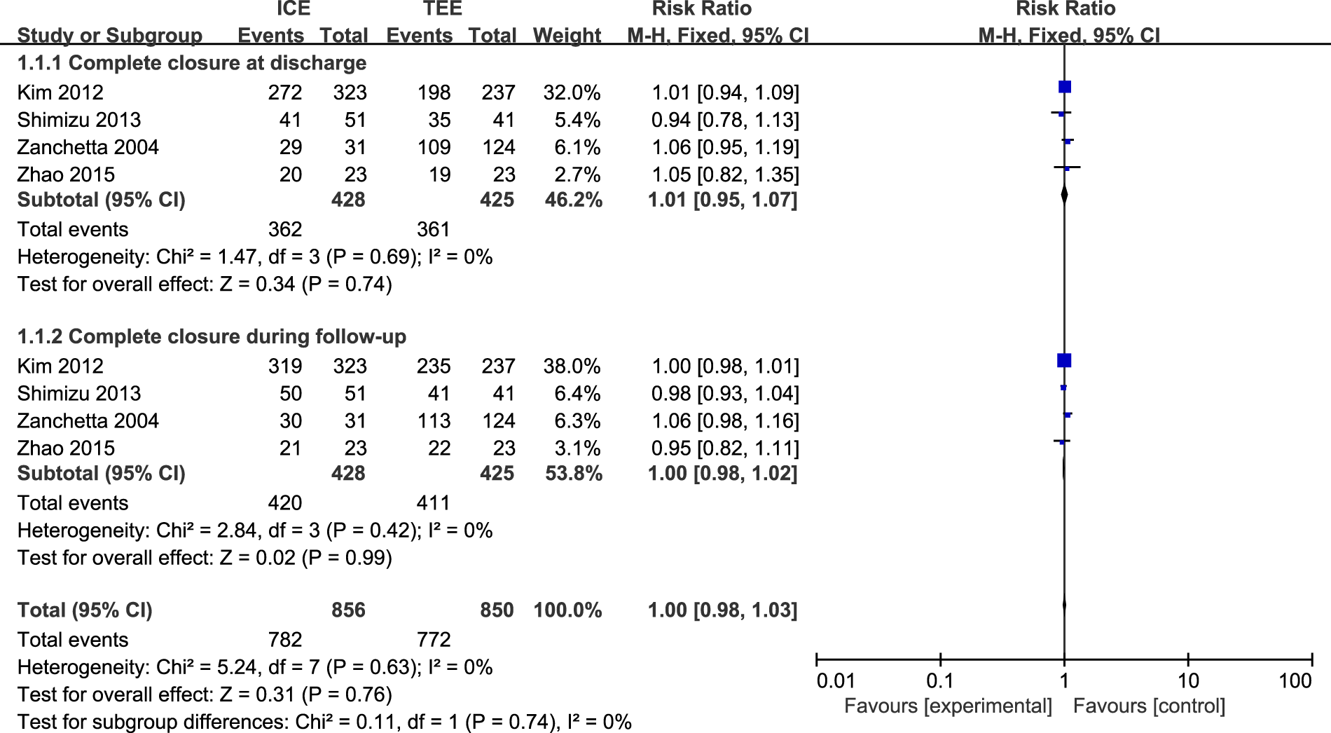 Four studies (25, 28–30) including 825 patients evaluated complete closure. No statistical heterogeneity was found among the studies (I2 = 0%, P = 0.63). There was no difference in complete closure between ICE group and TEE group in the pooled results (RR = 1.00, 95% CI = 0.98 to 1.03, P = 0.74). A subgroup analysis was performed and no significant difference was found between ICE group and TEE group in complete closure at discharge (RR = 1.01, 95% CI = 0.95 to 1.07; P = 0.74) and follow-up (RR = 1.00, 95% CI = 0.98 to 1.02; P = 0.99, Figure 4). All included patients were all ASD patients, and subgroup analysis by disease type was not available.