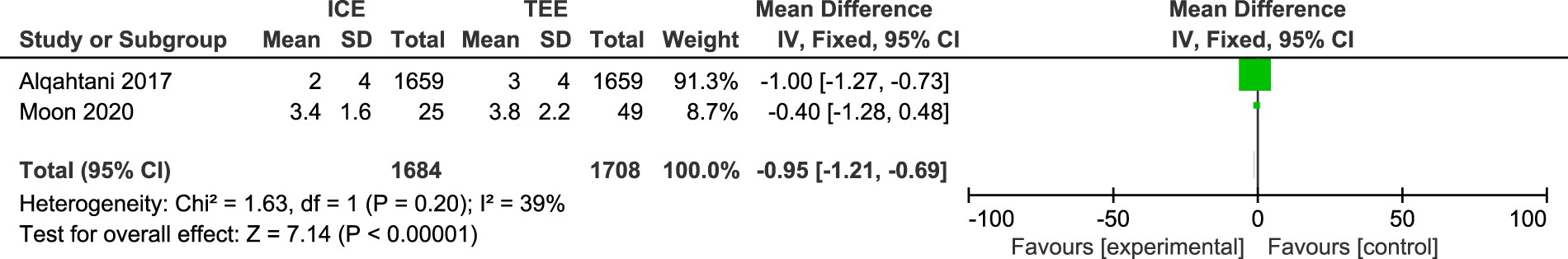 Two studies (31, 33) including 3,392 patients reported the length of stay at hospital, heterogeneity among the studies was relatively low (I2 = 39%, P = 0.20). Compared to TEE for ASD and PFO, ICE can reduce the length of stay at hospital [MD = −0.95 (95% CI = −1.21 to −0.69) days; P < 0.00001, Figure 5].