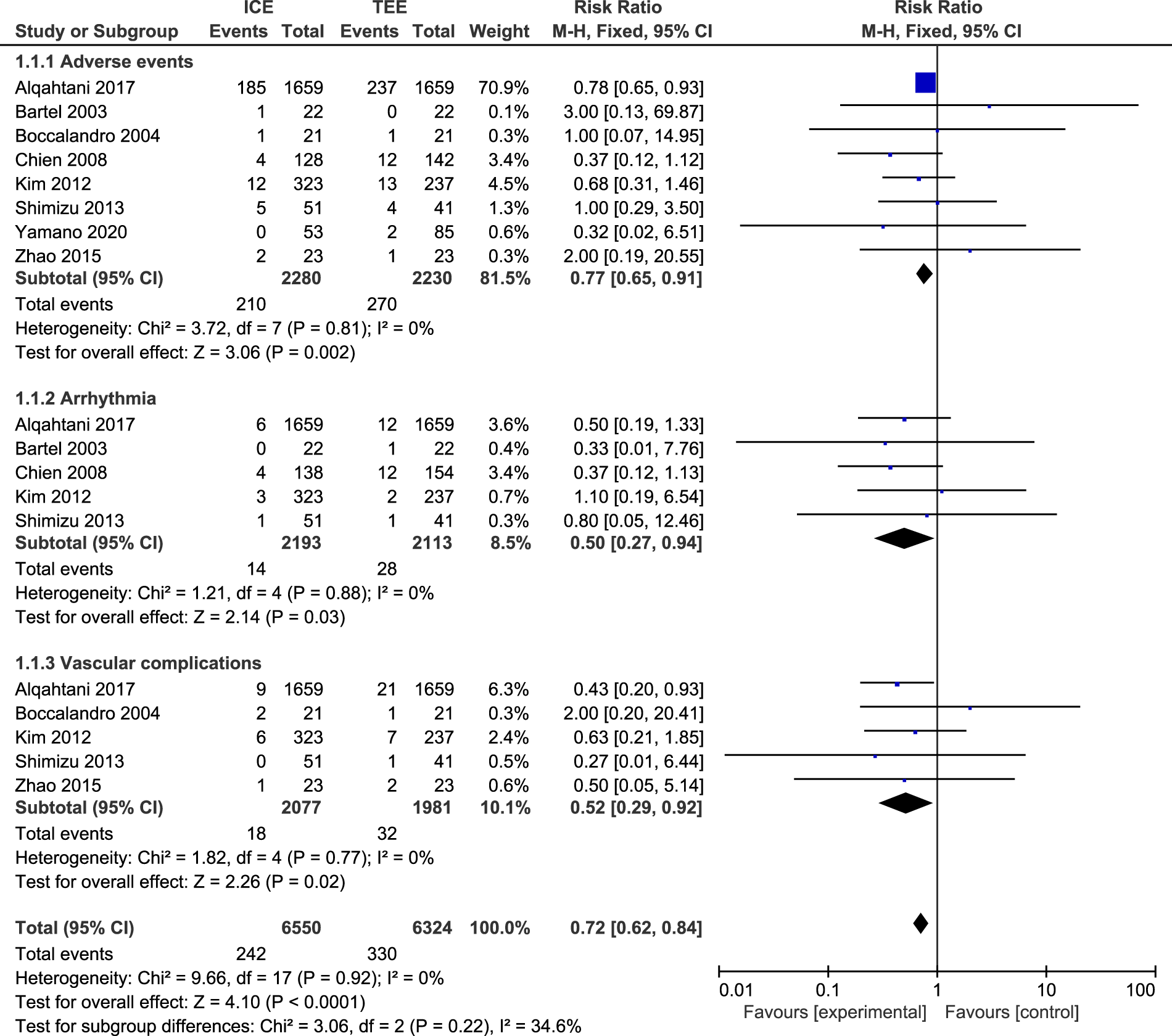 Eight studies (23, 24, 27–32) including 4,510 patients reported adverse events, we selected a fixed-effect model for meta-analysis because I-squared was less than 50% (I2 = 0%, P = 0.92). The adverse events of TEE were significantly higher than that in the ICE (RR = 0.72, 95%CI:0.62 to 0.84, P = 0.002, Figure 6). We further conducted subgroup analysis on adverse events and we found that the arrhythmia (RR = 0.50, 95%CI = 0.27 to 0.94, P = 0.03, Figure 6) and vascular complications (RR = 0.52, 95%CI = 0.29 to 0.92, P = 0.02, Figure 6) in ICE group were lower than those in TEE group.