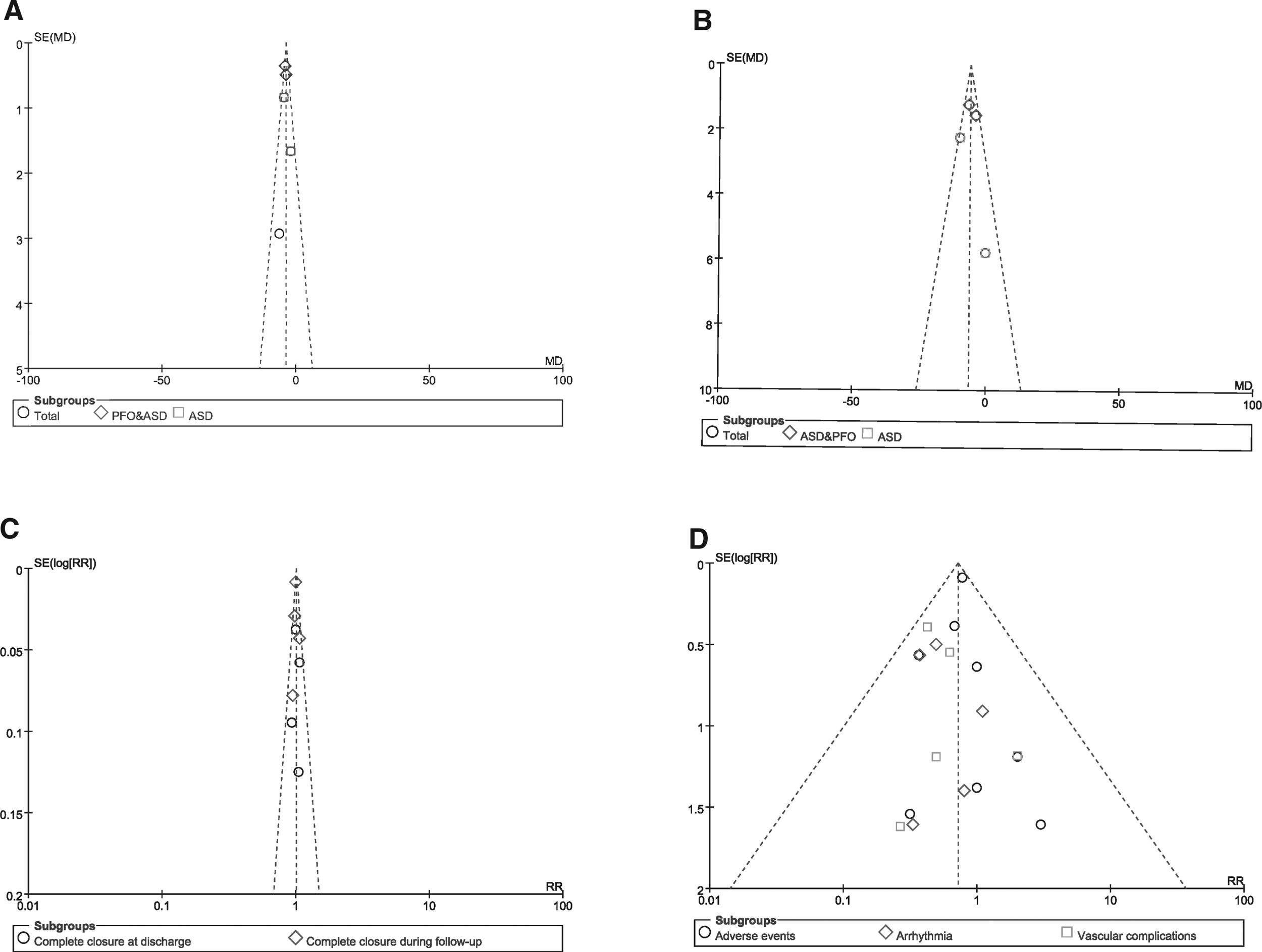 Funnel plot of publication bias. (A) Funnel plots for the meta-analysis of the FT; (B) Funnel plots for the meta-analysis of the PT; (C) Funnel plots for the meta-analysis of complete closure; (D) Funnel plots for the meta-analysis of adverse events.
