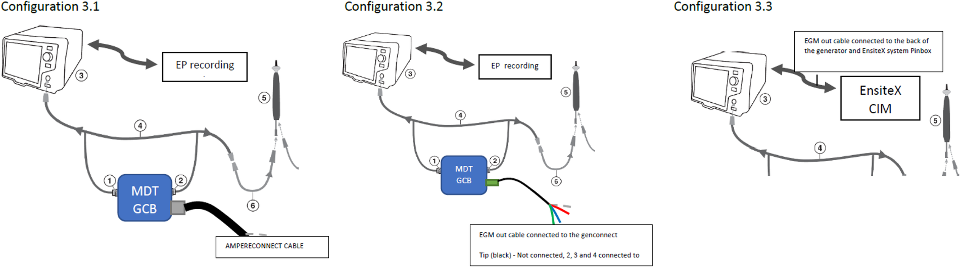 Test configurations (setups). Configuration 3.1—DTA connected to the EnsiteX via AmpereConnect cable connected to the MDT Genconnect. Configuration 3.2—DTA connected via EGM out cable from the genconnect to the Ensite CIM (without distal as it is not wired). Configuration 3.3 EGM cable from RFG back to CIM and not from genconnect.