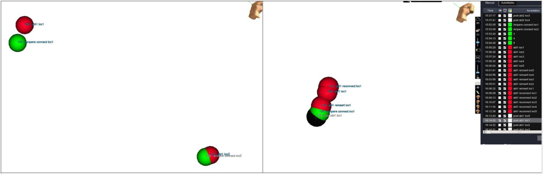 In this configuration a significant shift was observed immediately after catheter insertion. Catheter position was away from baseline points and this dislocation increased during the RF delivery. This may be linked to the fact that in this configuration no proper RF filtering is used. Due to huge baseline shift, further RF applications were not delivered as could be harmful for the EAM system with no added value as this configuration was suboptimal, Table 2 and Supplementary Table S2.