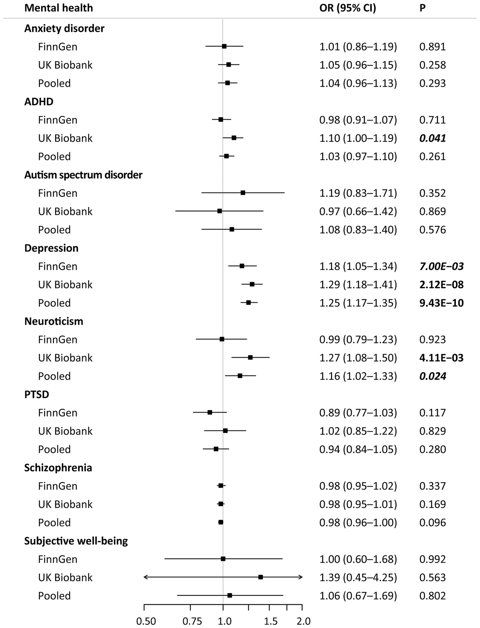 The main results of MR associations of genetically predicted mental health with the risk of hypertension are shown in Figure 3. After correction for multiple testing, genetic liability to depression was significantly associated with the risk of hypertension. In the pooled analyses, genetic liability to depression was also associated with higher risk of hypertension (odds ratio [OR], 1.25; 95% confidence interval [CI], 1.17–1.35; p < 0.001) (Figure 3; Supplementary Figure S1). The MR analyses also showed a suggestive association that higher weighted neuroticism sum-score (1 SD increase) was associated with higher risk of hypertension (OR, 1.16; 95% CI, 1.02–1.33; p < 0.05), even though not reaching the Bonferroni-corrected threshold of p < 6.25 × 10−3. No significant relationships were found with genetic liability to anxiety disorder, ADHD, autism spectrum disorder, PTSD, schizophrenia, and higher subjective well-being measure score (Figure 3). Significant heterogeneity between the FinnGen and UK Biobank was observed only in the meta-analysis on ADHD (I2 = 67.3%; p = 0.080) and neuroticism (I2 = 68.4%; p = 0.075).