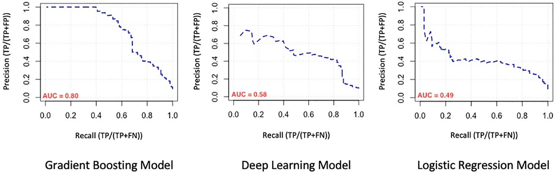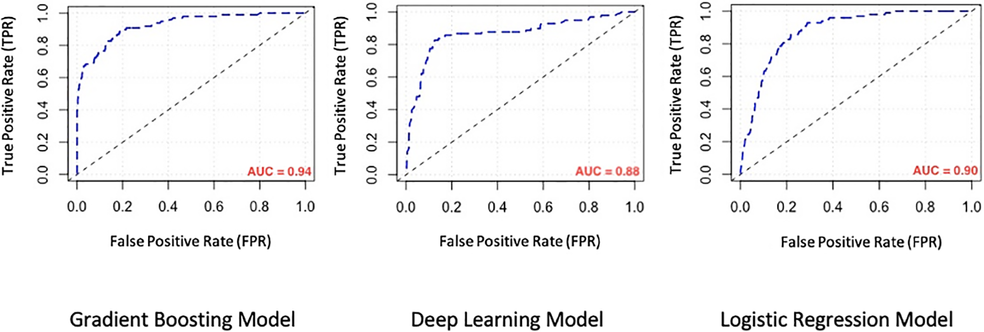 A total number of 1,017 patients were finally enrolled in the study, including 465 women and 552 men. Overall incidence of study main endpoint was 9.6%, (7.2% in men and 12.4% in women; p-value = 0.05). The overall performance of the GB model is better than the other two models (AUC: 0.94 for GB vs. 0.88 and 0.90 for DL and LR models respectively). Based on GB model, lower O2 saturation and right ventricle dilation and dysfunction were among the strongest adverse event predictors.