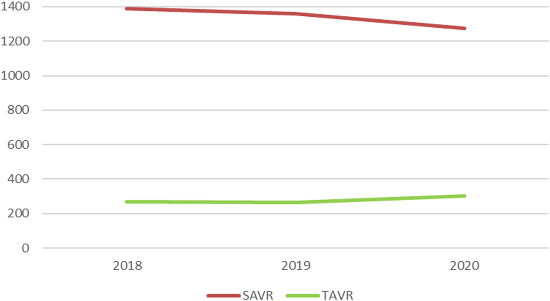 Numbers of SAVR and TAVR for pure aortic regurgitation between 2018 and 2020 in Germany. SAVR, surgical aortic valve replacement; TAVR, transcatheter aortic valve replacement.