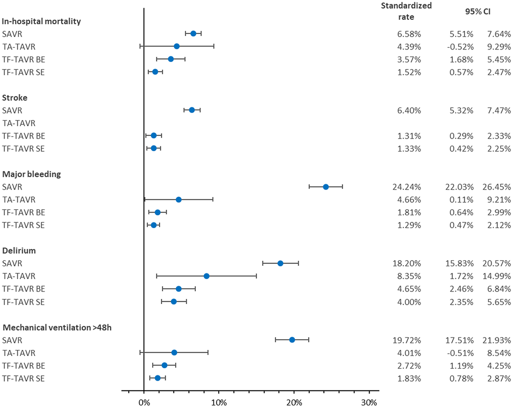 Unadjusted in-hospital outcomes of patients treated for aortic regurgitation between 2018 and 2020 in Germany. BE, balloon-expandable; SAVR, surgical aortic valve replacement; SE, self-expanding; TA, transapical; TAVR, transcatheter aortic valve replacement; TF, transfemoral.