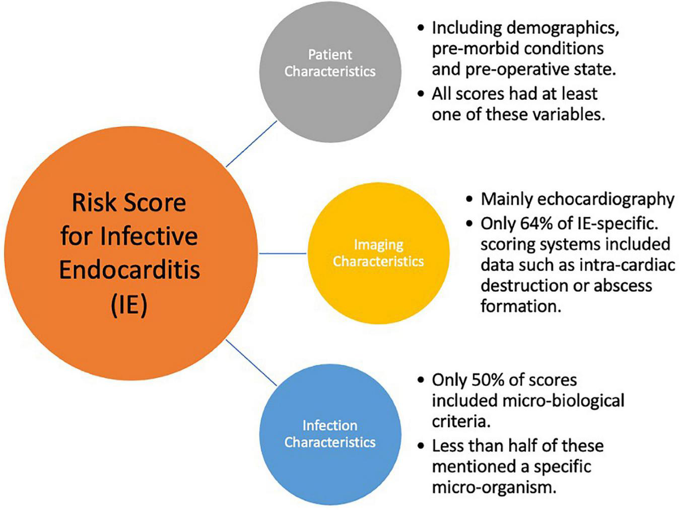 Of 75 articles initially identified, 32 papers were analyzed for a total of 20 proposed scores (range 66–13,000 patients), 14 of which were specific for IE. The number of variables per score ranged from 3 to 14 with only 50% including microbiological variables and 15% including biomarkers. The following scores had good performance (AUC > 0.8) in studies proposing the score (often the derivation cohort); however fared poorly when applied to a new cohort: PALSUSE, DeFeo, ANCLA, RISK-E, EndoSCORE, MELD-XI, COSTA, and SHARPEN. DeFeo score demonstrated the largest discrepancy with initial AUC of 0.88, compared to 0.58 when applied to different cohorts. The inflammatory response in IE has been well documented and CRP has been found to be an independent predictor for worse outcomes. There is ongoing investigation on alternate inflammatory biomarkers which may assist in IE management. Of the scores identified in this review, only three have included a biomarker as a predictor.