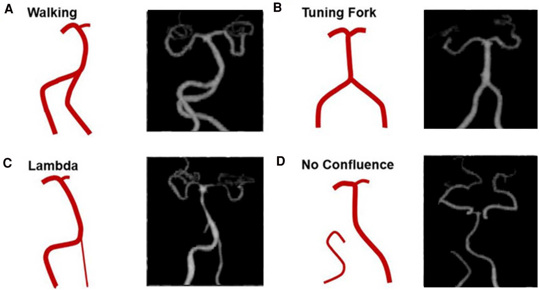 Four basic geometric configurations of vertebrobasilar artery: walking (A), tuning fork (B), lambda (C), and no confluence (D) (cited from Zheng et al., (8)).