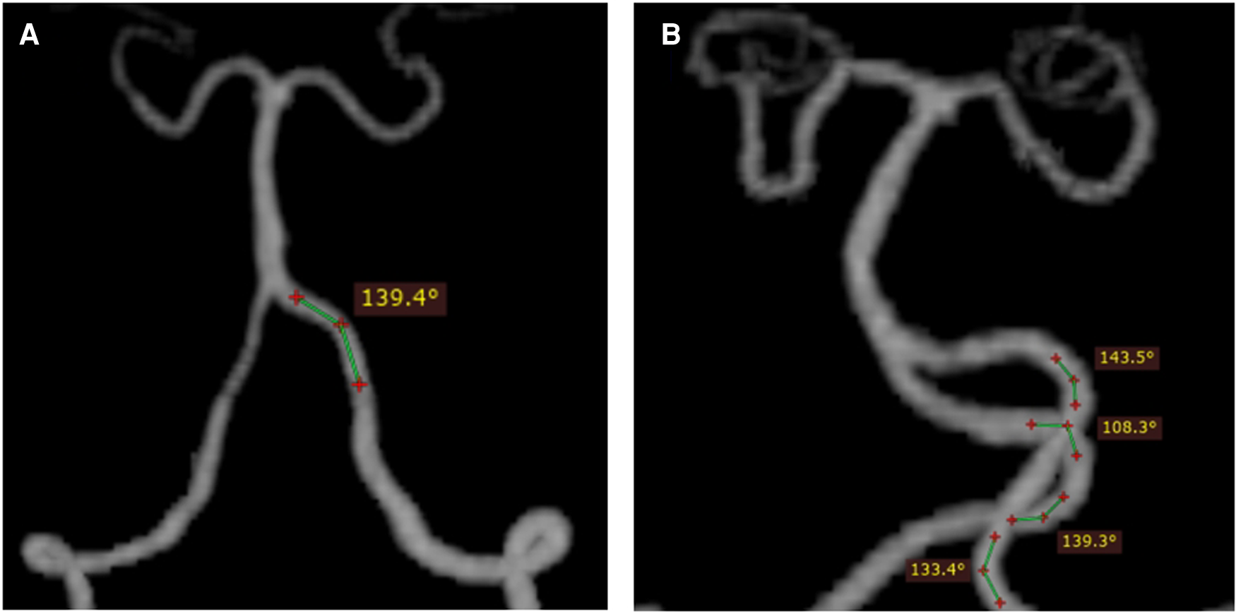 Schematic diagram of vascular curvature in the vertebral artery: oligo-bending group (the number of vascular bends <3) (A) and multibending group (the number of vascular bend ≥3) (B). From the vertex of a vascular curve, two lines were drawn to both sides. If the angle formed by the intersection of the two lines with the VA was ≤150°, a vascular bend was identified.