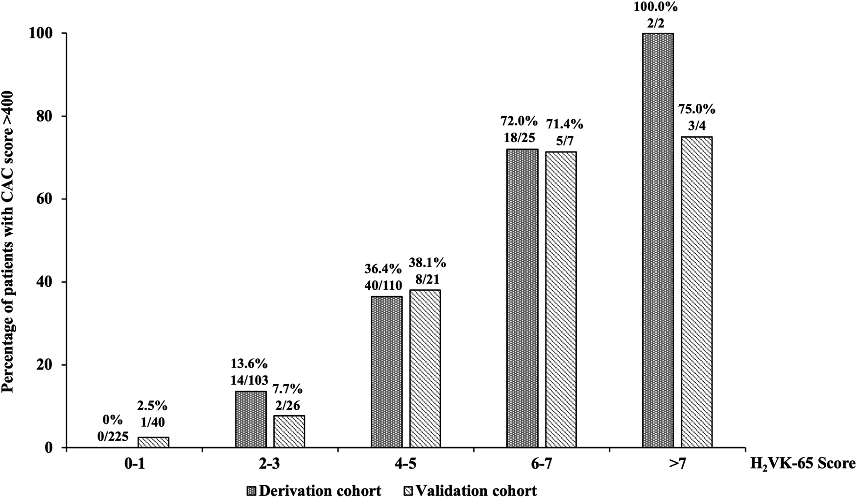 The novel H2VK-65 score demonstrated good performance for predicting high CAC scores in symptomatic patients referred for CCTA.