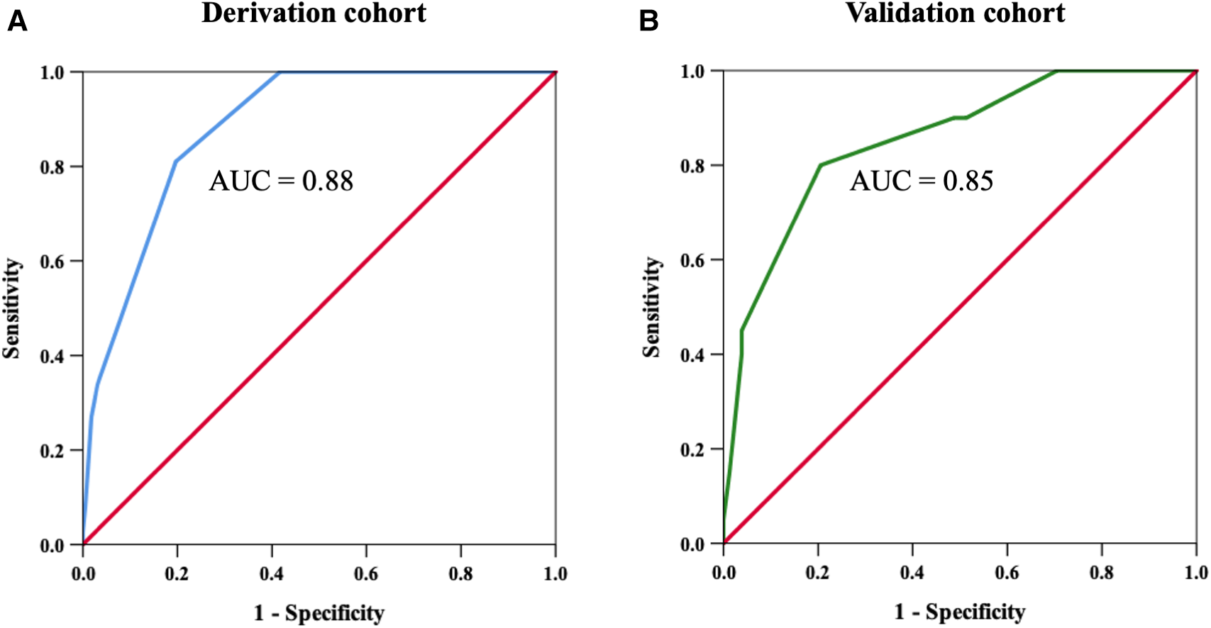 The factors found to be independently associated with high CAC from the multivariate analysis were used to develop a clinical risk assessment tool for predicting high CAC. A risk score was generated using the sum of assigned points, defined as the exponential of the estimated coefficient and rounded to the nearest integer. We performed receiver operating characteristic (ROC) curve analysis to evaluate the diagnostic performance of our score and to determine the best cutoff value for predicting a high CAC score. The accuracy, sensitivity, specificity, positive predictive value (PPV), and negative predictive value (NPV) were calculated. A validation cohort was used to evaluate the accuracy of the developed risk assessment tool.