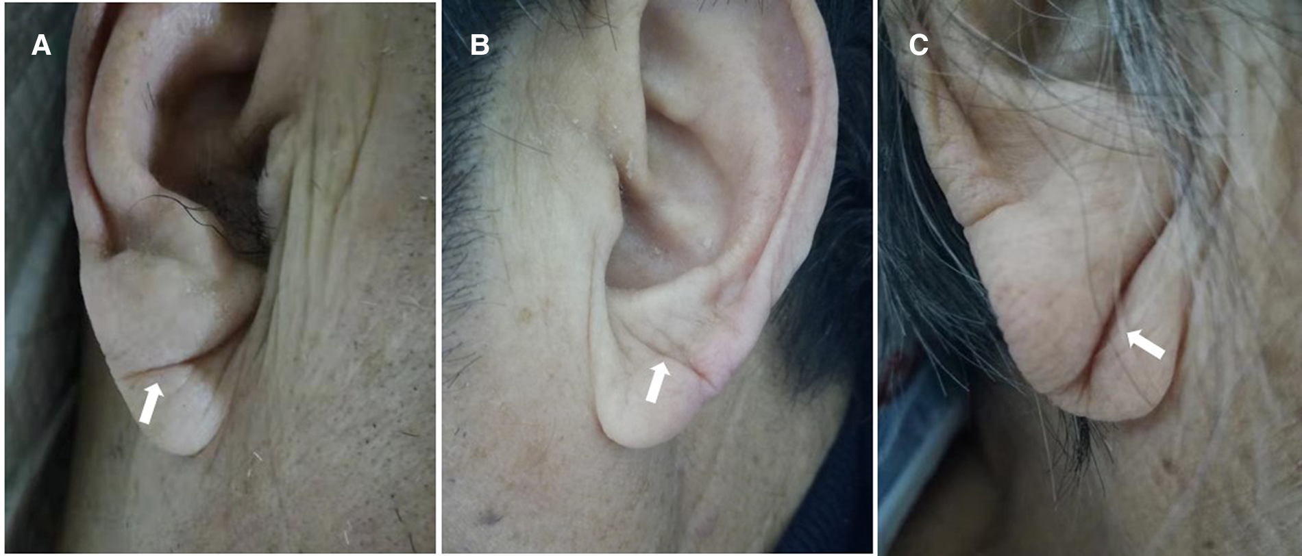 We took photographs of the bilateral ears of each patient. ELC was defined as a wrinkle-like line extending diagonally from the tragus and across the lobule to the rear edge of the auricle of the ear. A typical ELC is shown in Figure 1A (1). We divided patients with ELC into those who had unilateral vs. bilateral ELC and shallow vs. deep ELC (Figures 1B,C). ELC was considered shallow when the bilateral clear end of the fold could be seen. ELC was considered deep when the unilateral or bilateral end of the fold could not be seen (10).