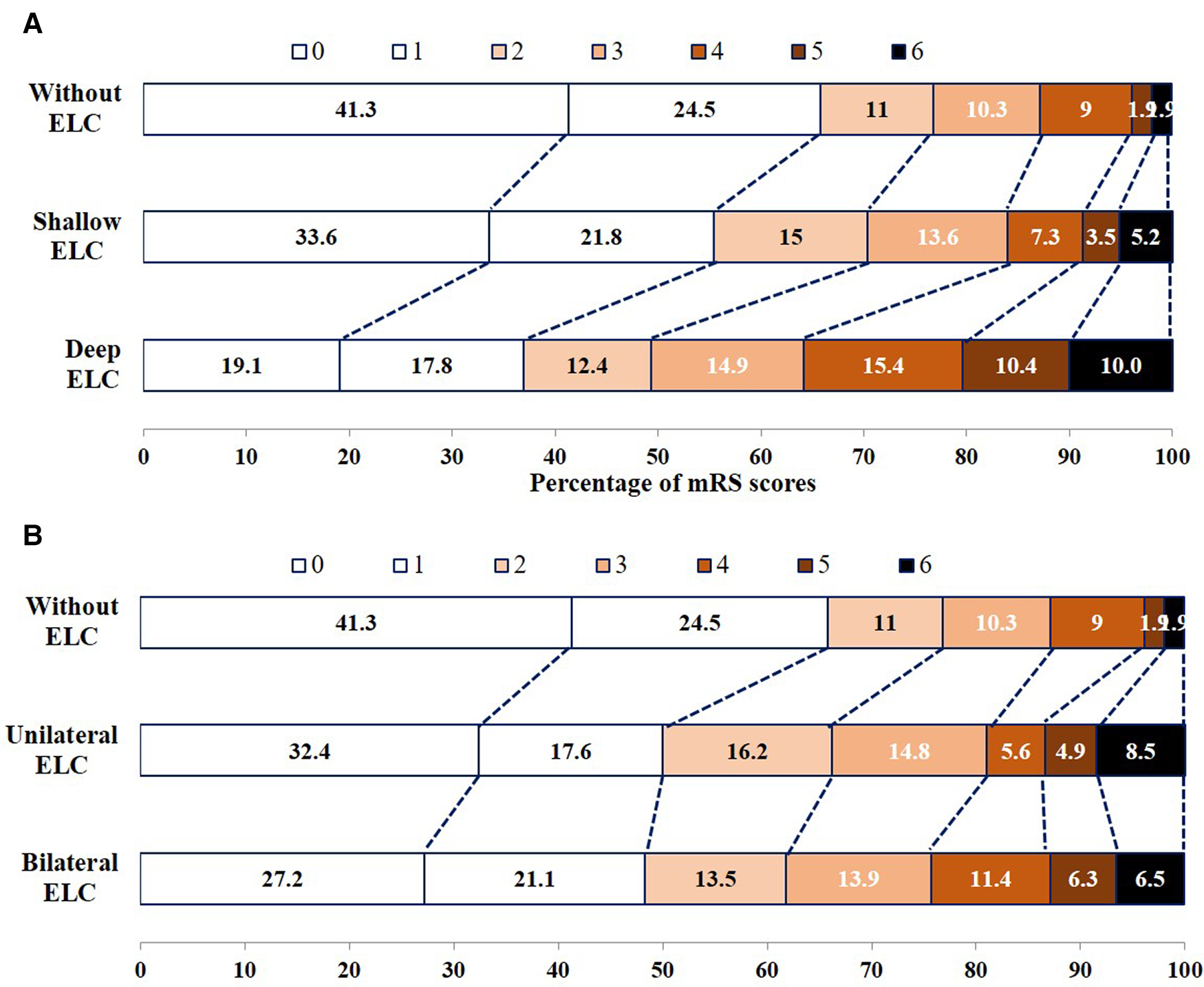 Among the 936 AIS patients, there were 746 (79.7%) patients with ELC. Among patients with ELC, there were 156 (20.9%) patients with unilateral ELC and 590 (79.1%) with bilateral ELC and 476 (63.8%) patients with shallow ELC and 270 (36.2%) with deep ELC. After adjusting for age, sex, baseline NIHSS score, and other potential covariates, patients with deep ELC were associated with a 1.87-fold [odds ratio (OR) 1.87; 95% confidence interval (CI), 1.13–3.09] and 1.63-fold (OR 1.63; 95%CI, 1.14–2.34) increase in the risk of poor functional outcome at 90 days in comparison with those without ELC or shallow ELC.