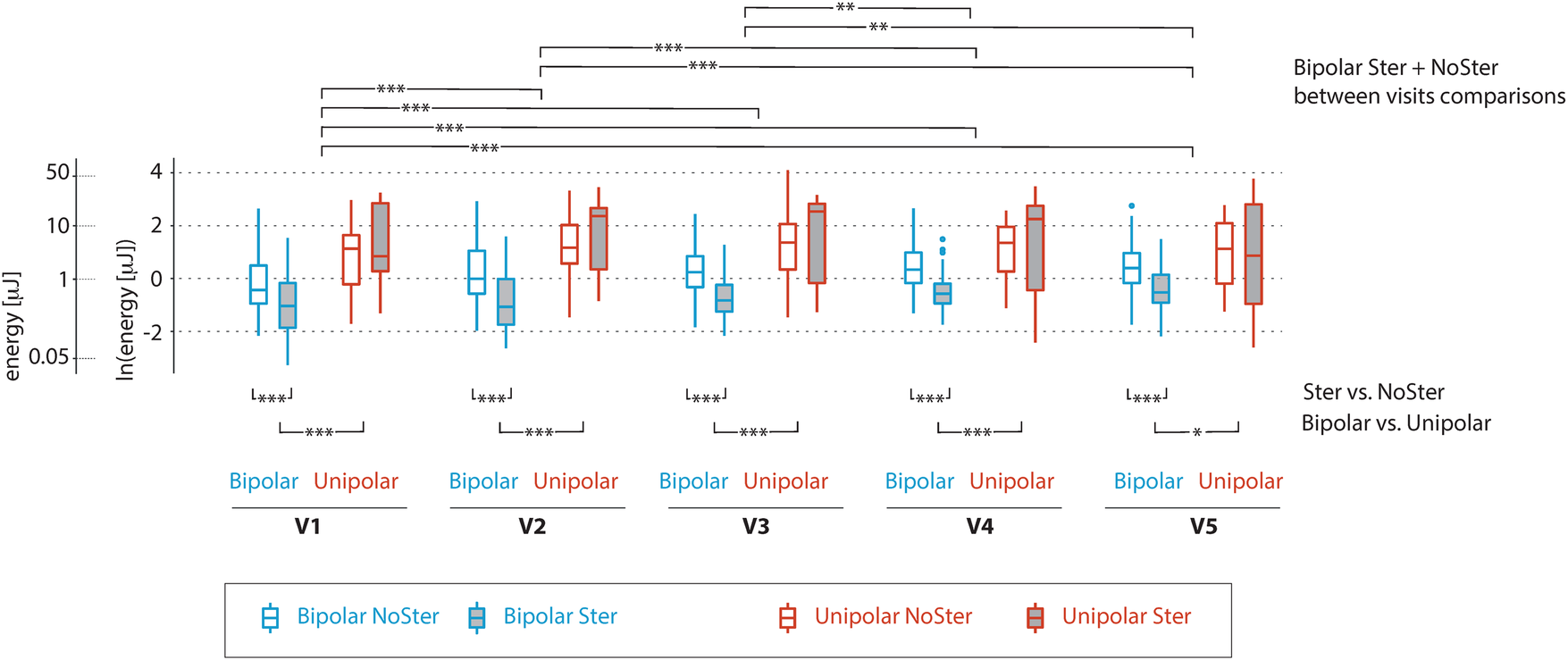Individual controls and energies of threshold pacing pulses first for the whole set then with a division into pseudo-unipolar and bipolar vectors (BI x UNI) and finally according to whether they are enhanced on their cathode with a slow-release Steroid (SE x NSE).