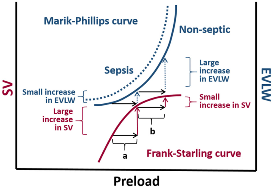 The Marik-Phillips and Frank-Starling curves correlating changes in extra vascular lung water (EVLW) and stroke volume (SV) with preload. For cardiac function correlating to the ascending limb of the Frank-Starling curve, an increase in preload induced by a fluid challenge (a) does not substantially increase EVLW. If a fluid challenge is administered to individuals whose heart is operating on the flat portion of the Frank-Starling curve, the increase in preload (b) may result in a large increase in EVLW. Due to endothelial glycocalyx damage associated with sepsis, larger increases in EVLW can be expected in septic individuals (dashed curve) (9, 10).