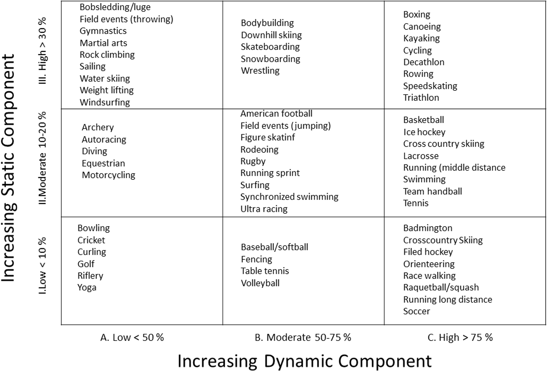 Postoperative exercise performance was evaluated based on the exercise stress test (EST) results, time to sport resumption, and level of sport intensity after cardiac surgery. For each patient, the last EST performed during routine cardiac follow-up was recorded in the medical record. Patients exercised to their maximum ability using a cycloergometer or a treadmill. The following criteria were collected: comprehensive EST results (normal/abnormal), arrhythmia (yes/no), blood pressure response (normal/abnormal), metabolic equivalent (expressed in METs) and VO2 max calculated (formula: VO2max = 3.5 × MET; expressed in ml/kg/min). EST results were compared to reference values observed in healthy volunteers (11). Level sport intensity was defined according to the classification of sports based on static and dynamic components (Figure 1) (12).