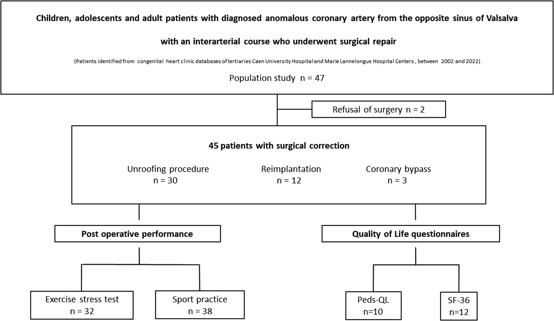 In a first step, we retrospectively identified consecutive adults, adolescents, and children with diagnosed ACAOS who underwent surgical repair from the congenital heart clinic databases of both tertiary Caen University Hospital Center and tertiary Marie Lannelongue Hospital Center. Eligible patients were identified by reviewing patients' medical records in the institution's informatics systems at both centres. Patients with other types of congenital coronary anomalies and patients with associated structural heart diseases were excluded from the study. Data, including patient characteristics, information related to ACAOS, and postoperative exercise performance, were collected. Second, selected patients were contacted to complete QoL questionnaires. All data were entered into a reliable database.
