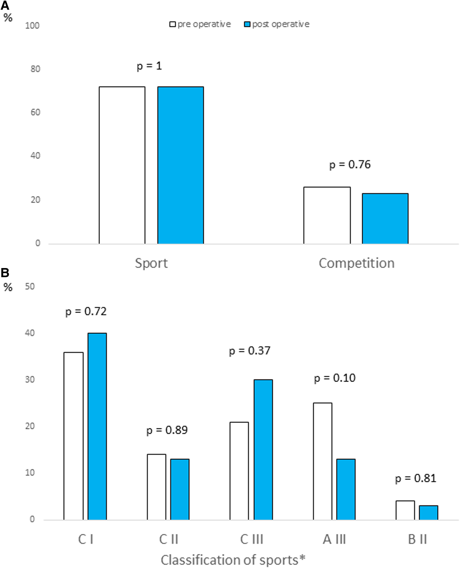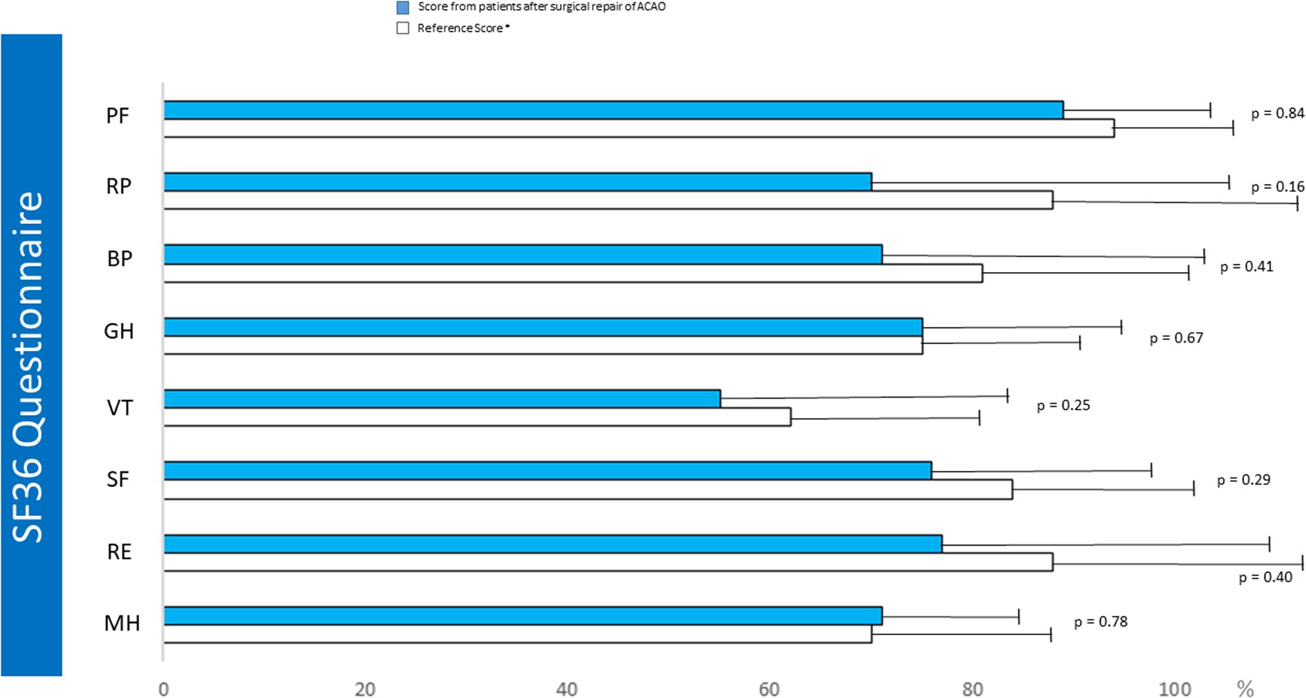Patients who underwent surgical repair for ACAOS between 2002 and 2022 were retrospectively identified. Information about sports activity and exercise performance based on metabolic equivalents of task (METs) calculated at the last exercise stress test, were collected. QoL was assessed using age-appropriate questionnaires (Paediatric QoL Inventory, cardiac module version 3.0 for patients <18 years; SF-36 QoL Inventory for adults). Patients' METS and patients’ QoL-scores were compared to reference population using the Wilcoxon test.