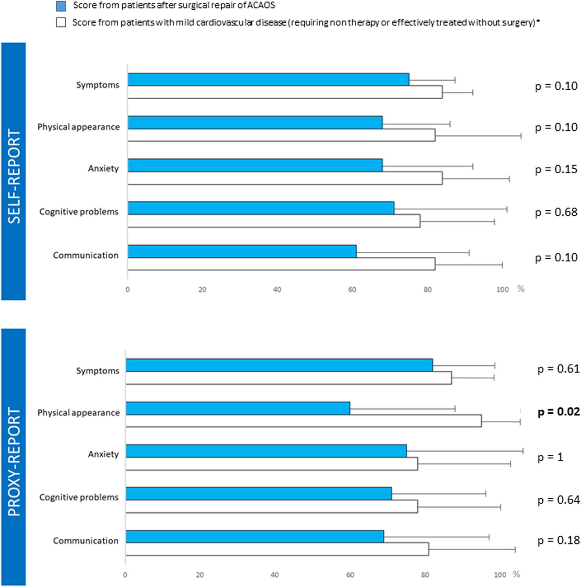 For patients aged ≤18 years, the PedsQL Paediatric Quality of Life Inventory, cardiac module version 3.0 was used (13). There were separate questionnaires for patients (self-report) and parents (parent-proxy report). The PedsQL 3.0 cardiac module has 5 scales: symptoms (7 items), perceived physical appearance (3 items), treatment anxiety (4 items), cognitive problems (5 items), and communication (3 items). An additional treatment barriers scale (5 items) is embedded in the module to measure adherence issues for patients who take medications. The validity and reliability of the PedsQL cardiac module scales for parent proxy reports for children aged 2 to 18 years and for self-reports for children aged 8 to 18 years were previously reported (14, 15). The questionnaires were divided by age into child (8 to 12 years) and teenager (13 to 18 years) groups. A 5-point scale is used for child self-report and parent proxy reports (0, never a problem; (1) almost never a problem; (2) sometimes a problem; (3) often a problem; and (4) almost always a problem). Items are reverse-scored and linearly transformed to a scale with scores ranging from 0 to 100 points such that higher scores indicate better QoL. PedsQL scores were compared to health-related QoL scores from a reference paediatric population with a mild cardiovascular disease requiring no therapy or effectively treated without surgery (14).