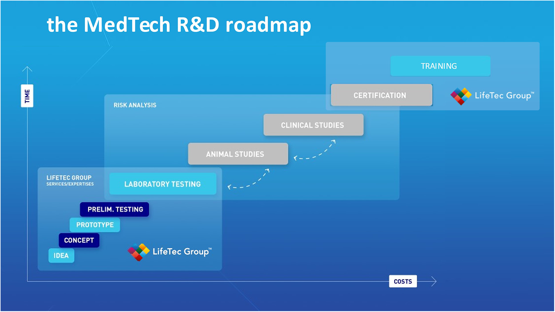 The R&D track is time-consuming and even before launching the final product on the market, proving the product's compliance with the safety and efficacy standards needed for market approval is expensive (62). Development from invention to a certified product ready for marketing has many procedural steps: the incremental costs connected to each subsequent step reflect the growth in value of technology and the potential success that your product will have before launched. The credibility that your company will offer to your future customers is also based on the quality of those tests.