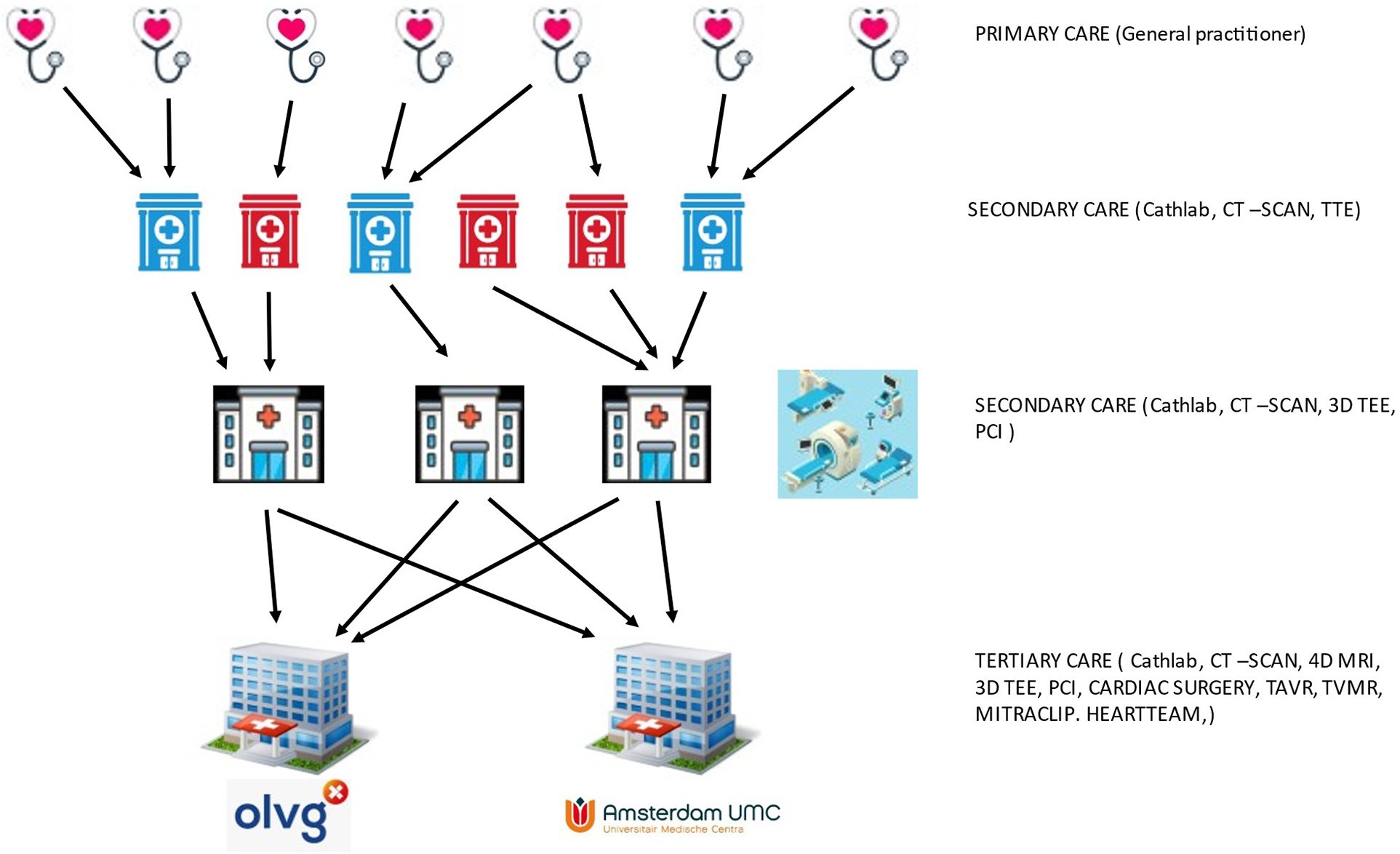 Schematic representation of referral paths and primary to tertiary cardiac care in Amsterdam.