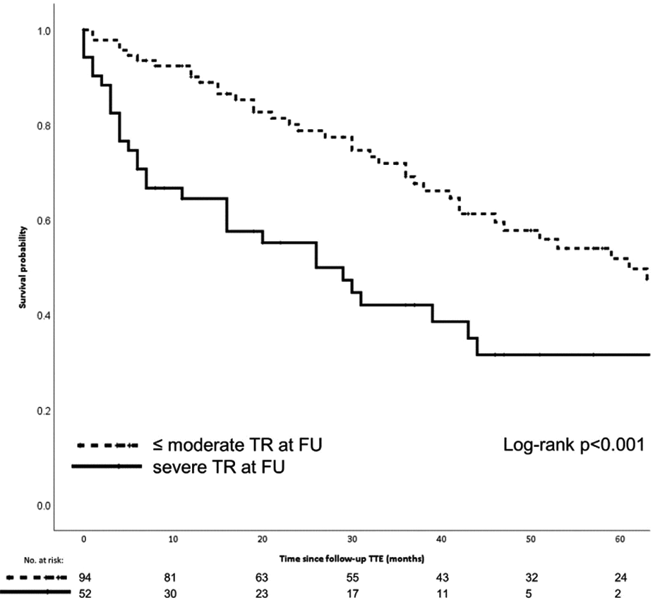 The Kaplan-Meier graphic shows the 5-year survival probability for patients who underwent Mitraclip repair with and without serious residual tricuspid valve regurgitation. Meijerink F, et al. Tricuspid regurgitation after transcatheter mitral valve repair: Clinical course and impact on outcome. Catheter Cardiovasc Interv. 2021 Sep;98(3):E427-E435. doi: 10.1002/ccd.29464.