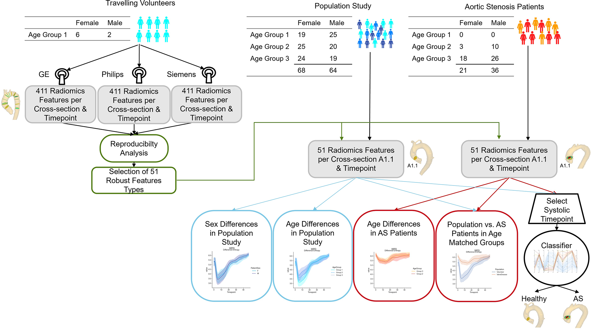 Flow chart of the presented study. Image data from eight volunteers acquired with GE, Philips and Siemens scanners are used to assess the reproducibility of 411 radiomics features extracted on twelve imaging planes across the thoracic aorta throughout the cardiac cycle. The 51 most robust features are extracted for age- and sex- stratified cohorts of aortic stenosis patients and subjects without valve diseases for comparison. Age-matched cohorts are used to assess whether differences in flow profile are identifiable in the radiomics signatures. Finally, a classifier to differentiate healthy subjects from aortic stenosis patients is trained on the radiomics features of a cross-section in the ascending aorta (A1.1) for a peak systolic timeframe.