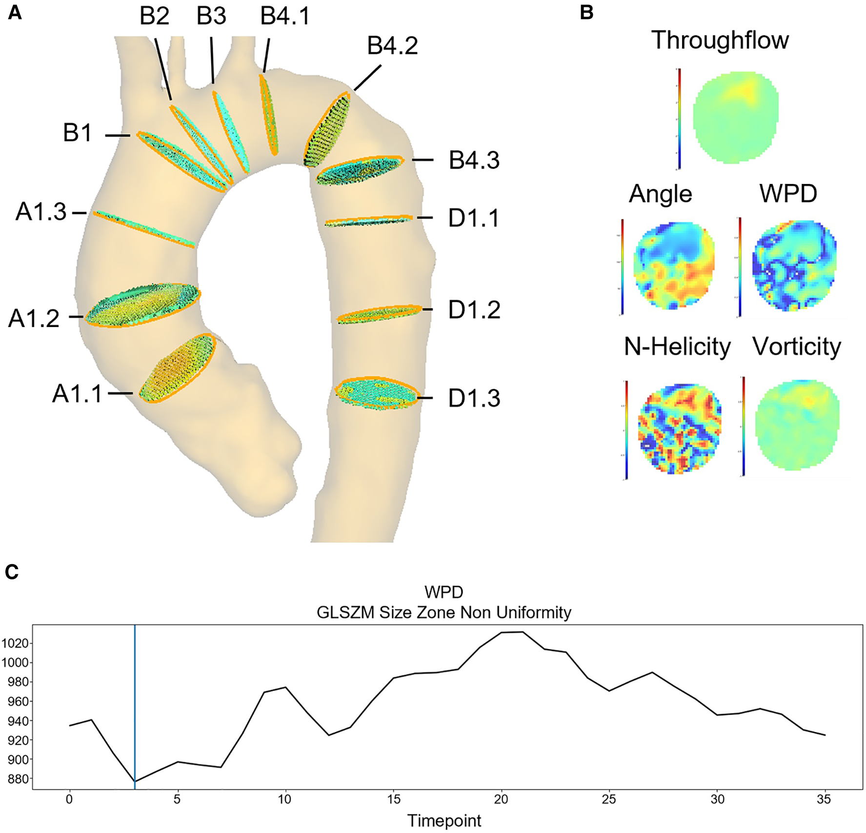 Feature extraction example: (A) 12 standardized image planes covering the ascending aorta, the aortic arch and the descending aorta. (B) Flow parameter maps calculated for each segmented image plane and timeframe (here plane A1.1): throughflow, angle, WPD, LNH and vorticity. (C) Feature curve showing the GLSZM Non-Uniformity based on the WPD map throughout the cardiac cycle on plane A1.1.
