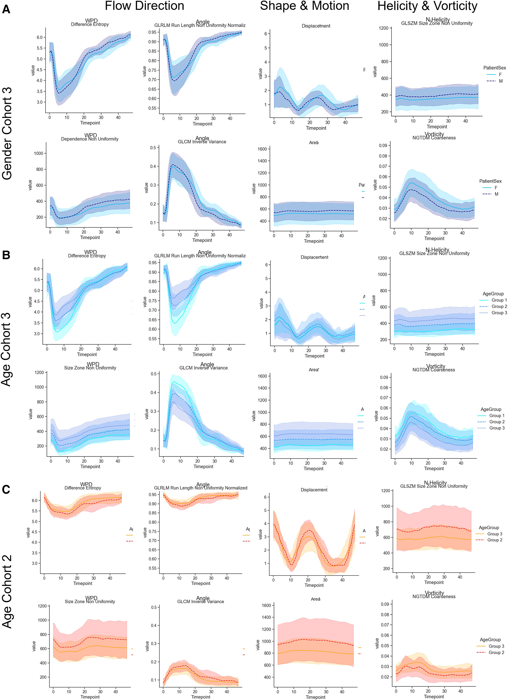 (A) Comparison of radiomics feature value ranges in male and female in cohort 3. (B) Comparison of radiomics feature value ranges for different age groups for cohort 3 (no valve disease). The curves represent age groups 1–3. (C) Shows the curves of age groups 2 and 3 for cohort 2 (aortic valve stenosis). The selected features describe patterns related to the flow direction, shape and motion, and normalized helicity and vorticity-related patterns over the complete cardiac cycle.