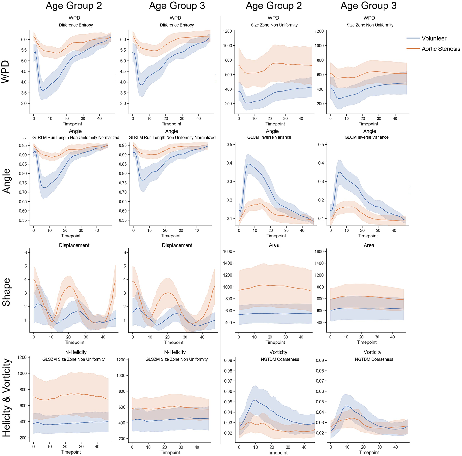 Comparison of radiomics feature value ranges for patients with aortic valve stenosis (cohort2: orange) and age-matched subjects from the population without valve diseases (cohort3: blue). The curves in row 1 show radiomics parameters extracted on WPD parameter maps over the complete cardiac cycle in age group 2 (40–59), and and in age group 3 (60–80). Together with with the parameters shown in row two, which were extracted from flow angle maps, these selected features describe patterns related to the flow direction. The parameters in row three describe the shape and motion, while the parameters in row four describe patterns related to normalized helicity and vorticity-related patterns over.