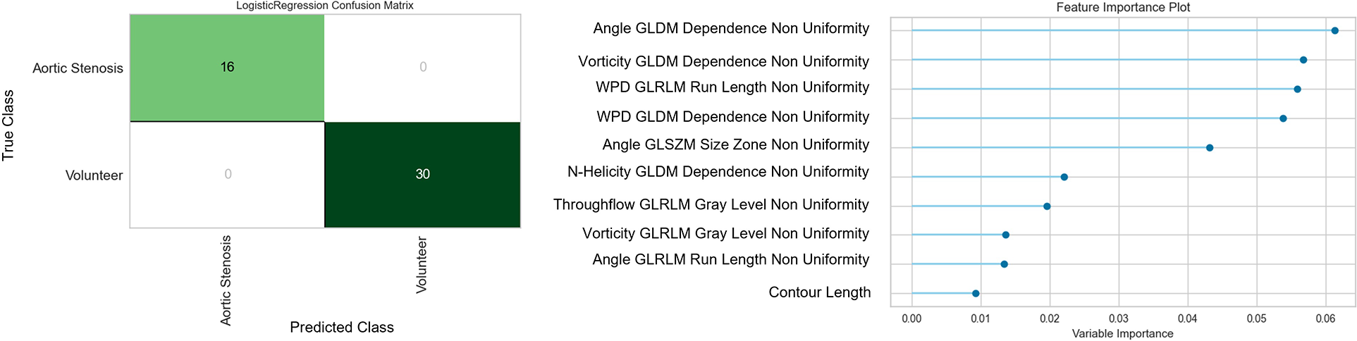 The logistic regression model trained on the 51 selected features extracted on the systolic feature maps on plane A1.1 achieves an accuracy and F1-value of 1.0 in the differentiation of cases with aortic stenosis and no valve disease. The confusion matrix and the feature importance analysis are displayed in Figure 5. The features found most important for the classification describe the texture patterns of flow angle, normalized helicity and wall parallelity degree.
