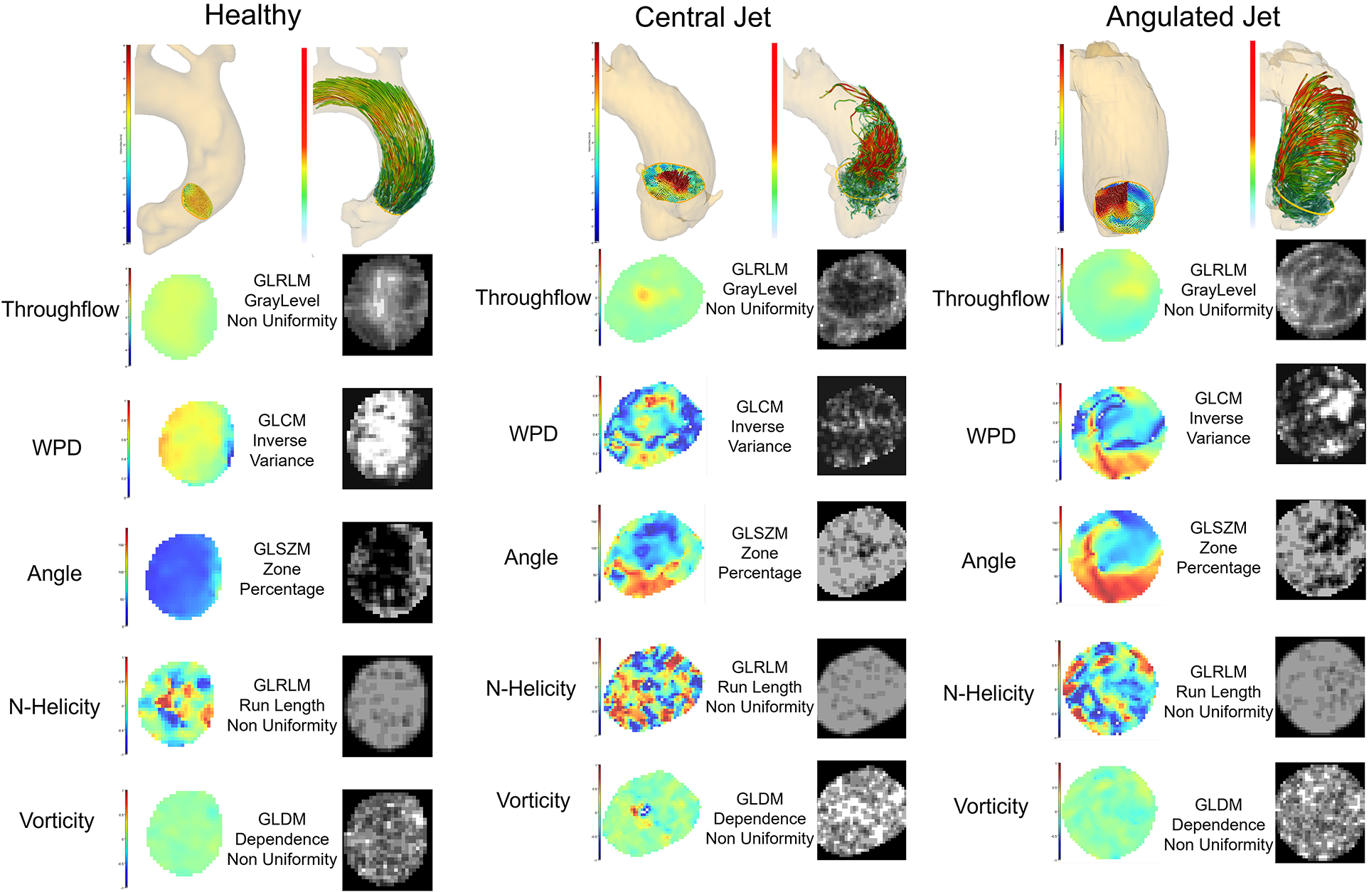 Dependence Non-Uniformity derived from the Gray Level Dependency Matrix (GLDM) showed moderate agreement for all maps except for throughflow. The Gray Level Dependence Matrix counts the number of occurrences of homogeneous regions with certain sizes. The Dependence Non-Uniformity measures the similarity of dependence, and a low value means fewer zones, indicating larger homogeneous regions. The last row in Figure 6 shows example vorticity maps and corresponding feature maps for three different cases in a systolic timeframe. Vorticity differences result in higher values while the values are low in homogeneous regions. Features such as the Inverse Variance and the Inverse Difference describe the local homogeneity of the parameter values based on the co-occurrence of neighboring parameter values (GLCM). The second row in Figure 6 shows the Inverse Variance feature for WPD maps. The examples show that the feature values are high where the change in the wall parallelity degree is low. If the Inverse Variance and Inverse Difference values of the throughflow-related parameter values (WPD, Angle) are high, the flow profile is smooth with continuous changes in all neighborhoods. The Gray Level Size Zone Matrix (GLSZM) contains the numbers of connected regions with homogeneous values. The Size Zone-Non-Uniformity measures the variability of size zone volumes and is low in the case of homogeneity. The Zone Percentage measures the coarseness and as displayed in row 3 of Figure 6, a high value indicates many regional changes. If the Zone Percentage is high for the throughflow-related parameters, the flow profile is rough or bumpy. For the vorticity map, parameters describing the heterogeneity of the texture patterns (Run Entropy) via the Gray Level Run Length Matrix (GLRLM) and the Coarseness defined via the parameter deviation from a neighbourhood average (derived from the Neighbouring Gray Tone Difference Matrix (NGTDM)) also show moderate agreement. The Gray Level Run Length Matrices contain the numbers of voxels with similar parameter values per direction. These matrices are then combined. The derived Non-Uniformity features show high values for irregular patterns. For the helicity and vorticity maps this could indicate turbulent flow or noise-affected vector fields. The Neighbouring Gray Tone Difference Matrix quantifies the difference between a value and the average value of its neighbours within a certain distance. A high Coarseness value derived from the NGTDM indicates strong value differences in the defined neighborhood. High values of this feature for the normalized helicity or vorticity indicate small turbulences or noise-affected vector fields.