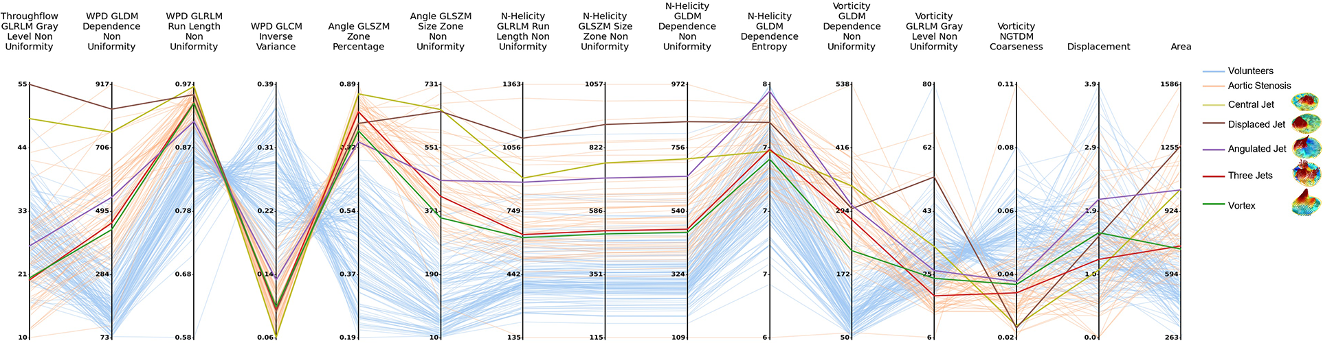 Parallel coordinates plot of selected radiomics features on data from all cases on slice A1.1. Features are extracted on the peak systolic phase with maximum volume flow rate. Examples of different central jet, displaced jet, angulated jet, three jets and vortex are highlighted.