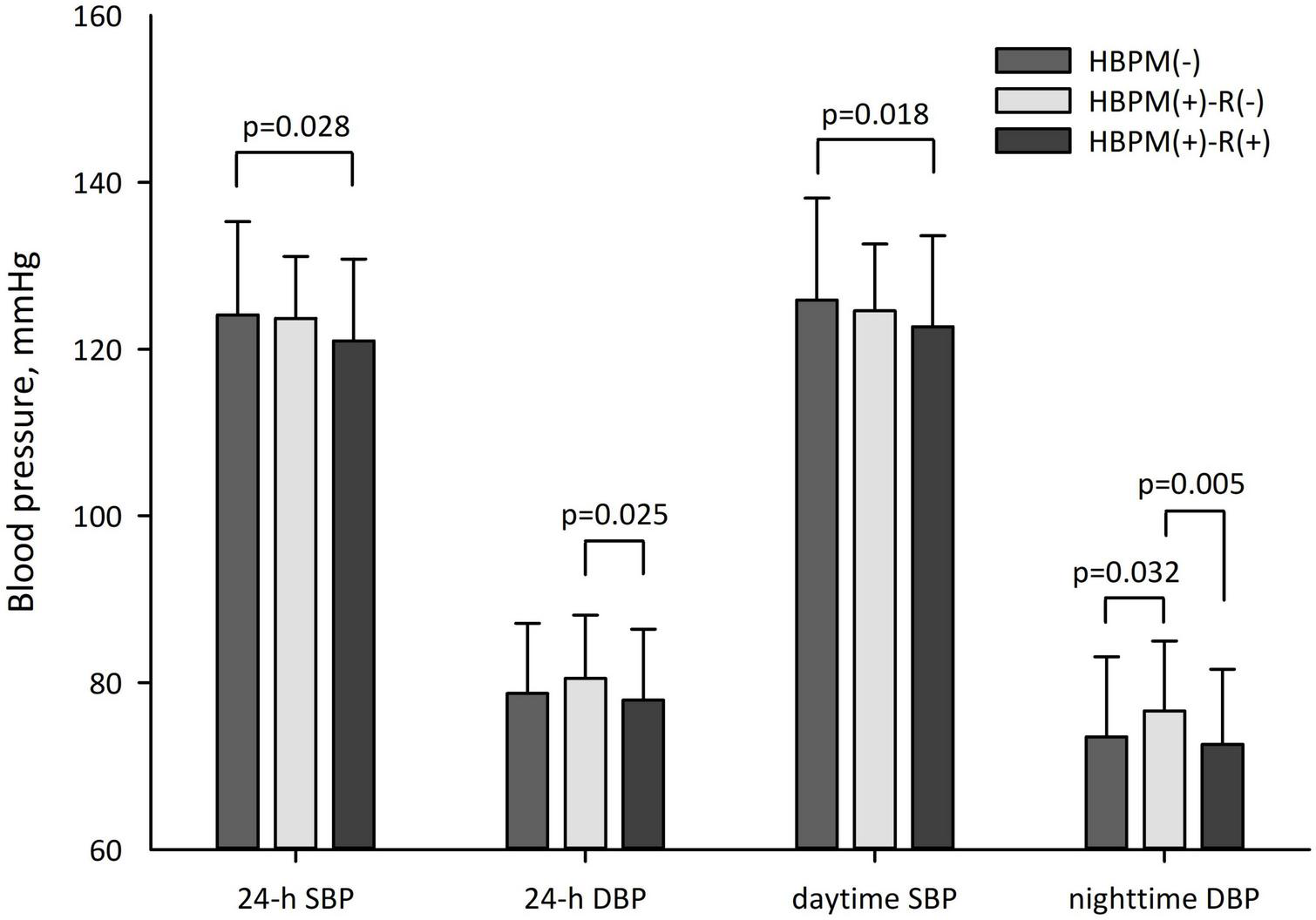 | HBPM(−) | HBPM(+) | HBPM(−) vs. HBPM(+) | HBPM(−) vs. HBPM(+)-R(−) vs. HBPM(+)-R(+) | |||||