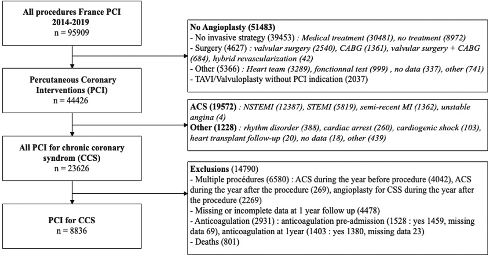 Between 2014 and 2019, 8.836 percutaneous coronary interventions for CCS from the France-PCI registry were evaluated, with 1 year follow up, after exclusion of patients receiving oral anticoagulants, procedures performed within one year of an acute coronary syndrome, and repeat angioplasty.