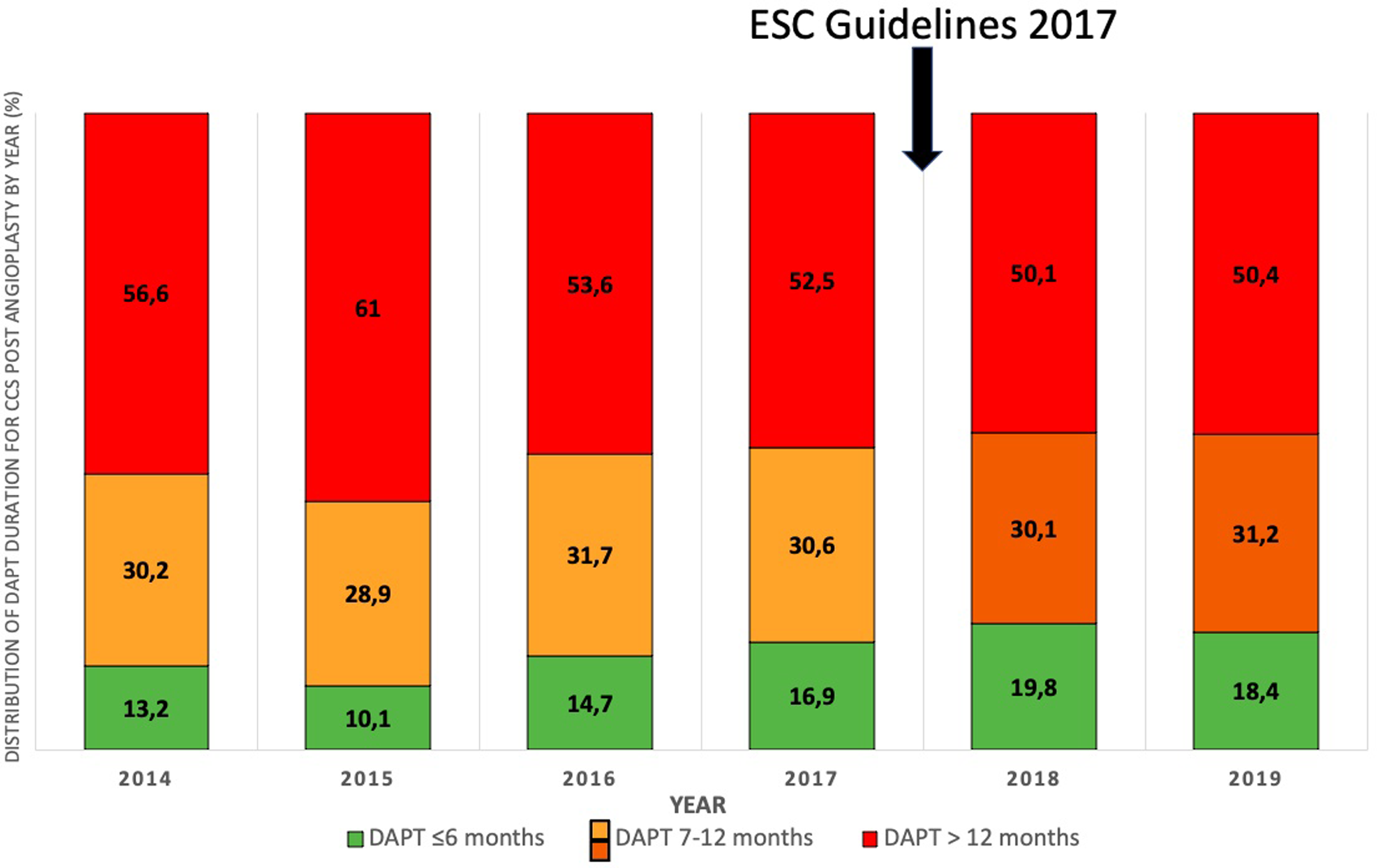 In this homogeneous population managed by angioplasty for CCS between 2014 and 2019, more than half of the procedures were followed by a duration of DAPT > 12 months (53.1%), higher than the duration recommended by European guidelines (3–5). No major changes in the duration of DAPT were found during this period, although the proportion of L-DAPT decreased slightly from 56.6% in 2014 to 50.4% in 2019 while S-DAPT rose from 13.2% in 2014 to 18.4% in 2019.