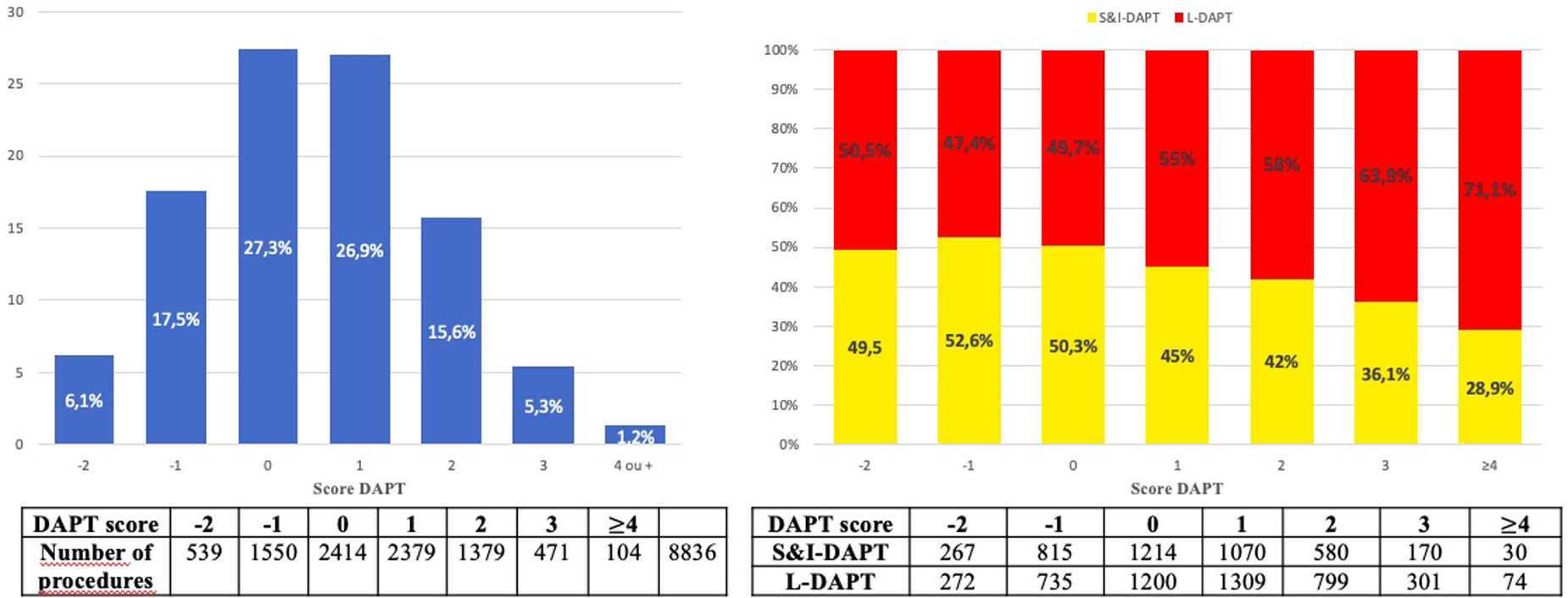 The distribution of DAPT score and the distribution of DAPT durations according to this score are shown in Figures 4.